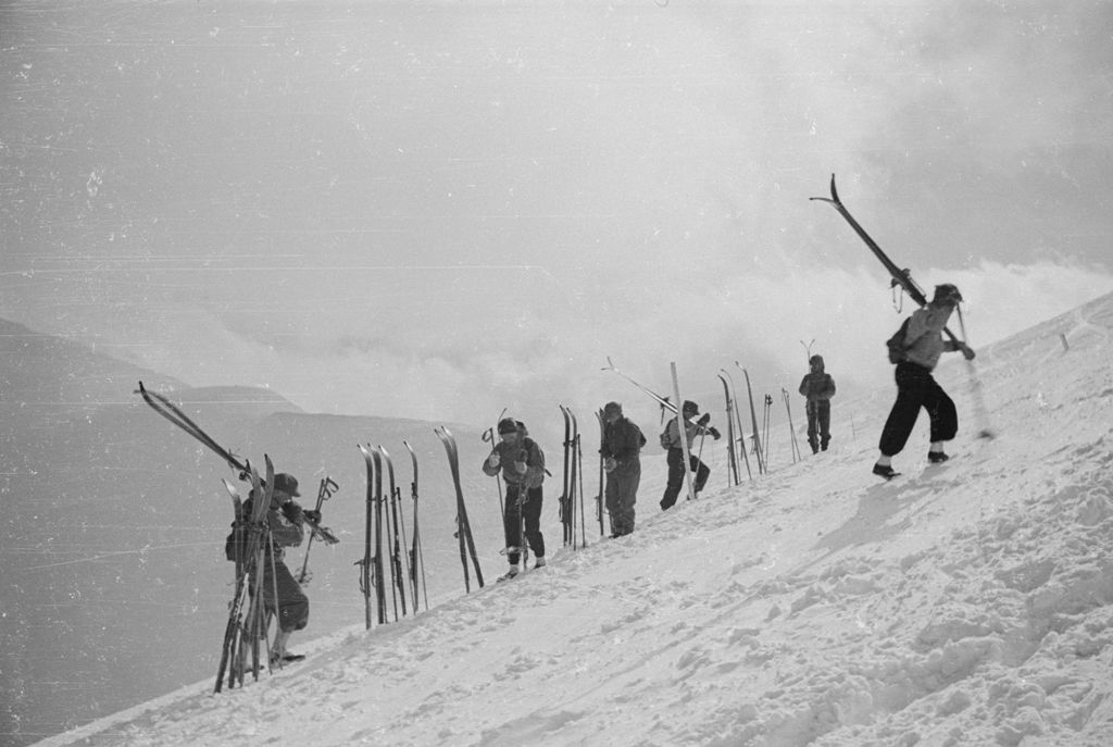 Narciarze na stoku, lata 30. XX w., ze zbiorów Muzeum Tatrzańskiego im. dra Tytusa Chałubińskiego w Zakopanem, fotografia prezentowana na wystawie