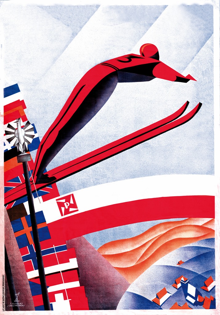 Plakat „FIS, Campionati Mondiali di Sci, Zakopane – Polonia”, 1938 r. Proj. Czesław Wielhorski, Leszek Piątkowski, ze zbiorów Muzeum Tatrzańskiego im. dra Tytusa Chałubińskiego w Zakopanem, plakat prezentowany na wystawie