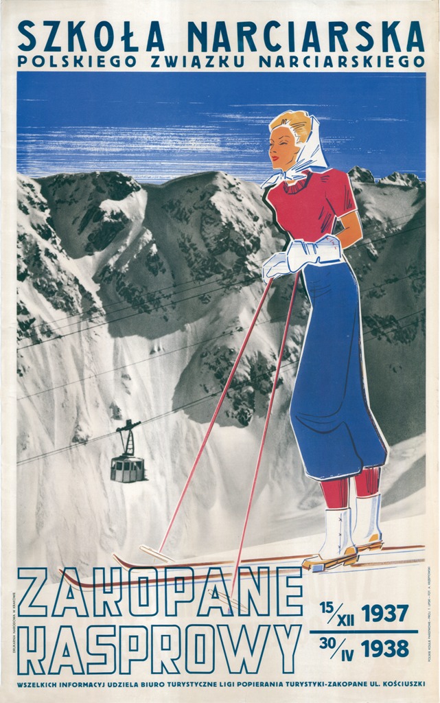 Plakat „Szkoła Narciarska Polskiego Związku Narciarskiego, Zakopane Kasprowy”, 1938 r. Proj. Tadeusz Lipski, fot. Adam Krzeptowski, ze zbiorów Muzeum Tatrzańskiego im. dra Tytusa Chałubińskiego w Zakopanem, plakat prezentowany na wystawie