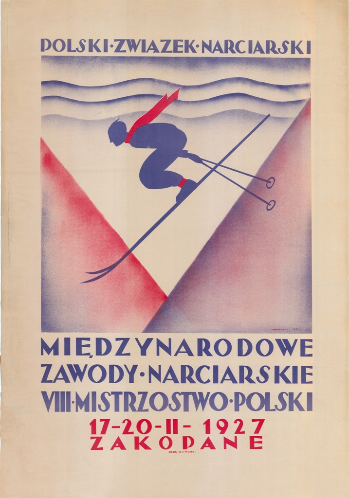 Plakat „Międzynarodowe Zawody Narciarskie VIII Mistrzostwo Polski, Zakopane”, 1927 r. Proj. Mieczysław Jurgielewicz, ze zbiorów Muzeum Tatrzańskiego im. dra Tytusa Chałubińskiego w Zakopanem, plakat prezentowany na wystawie