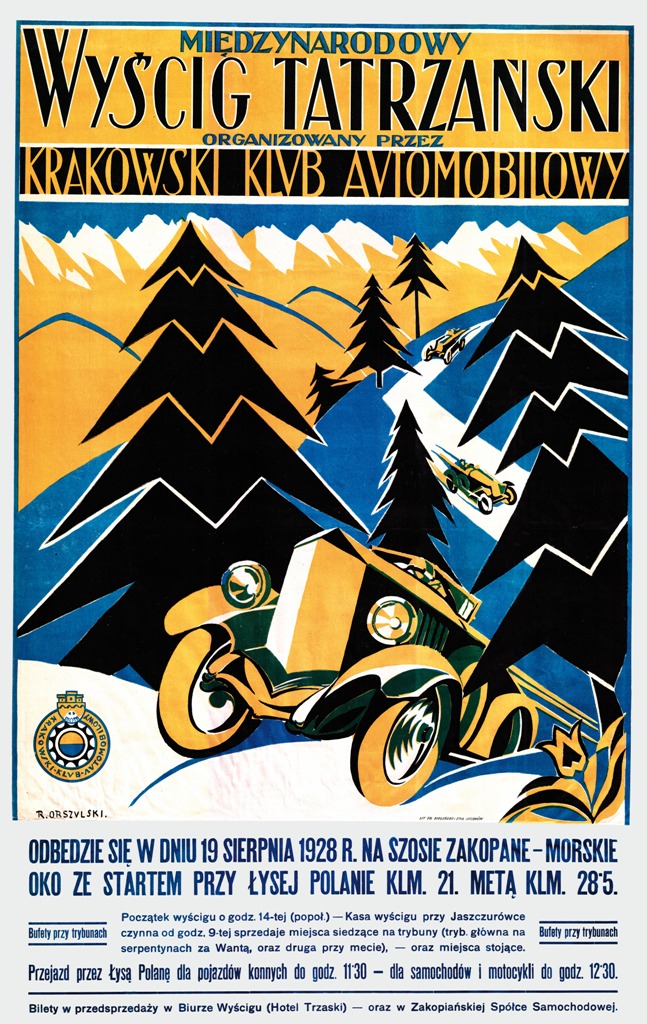 Plakat „Międzynarodowy Wyścig Tatrzański / Krakowski Klub automobilowy”, 1928 r. Proj. Roman Orszulski, ze zbiorów Muzeum Tatrzańskiego im. dra Tytusa Chałubińskiego w Zakopanem, plakat prezentowany na wystawie