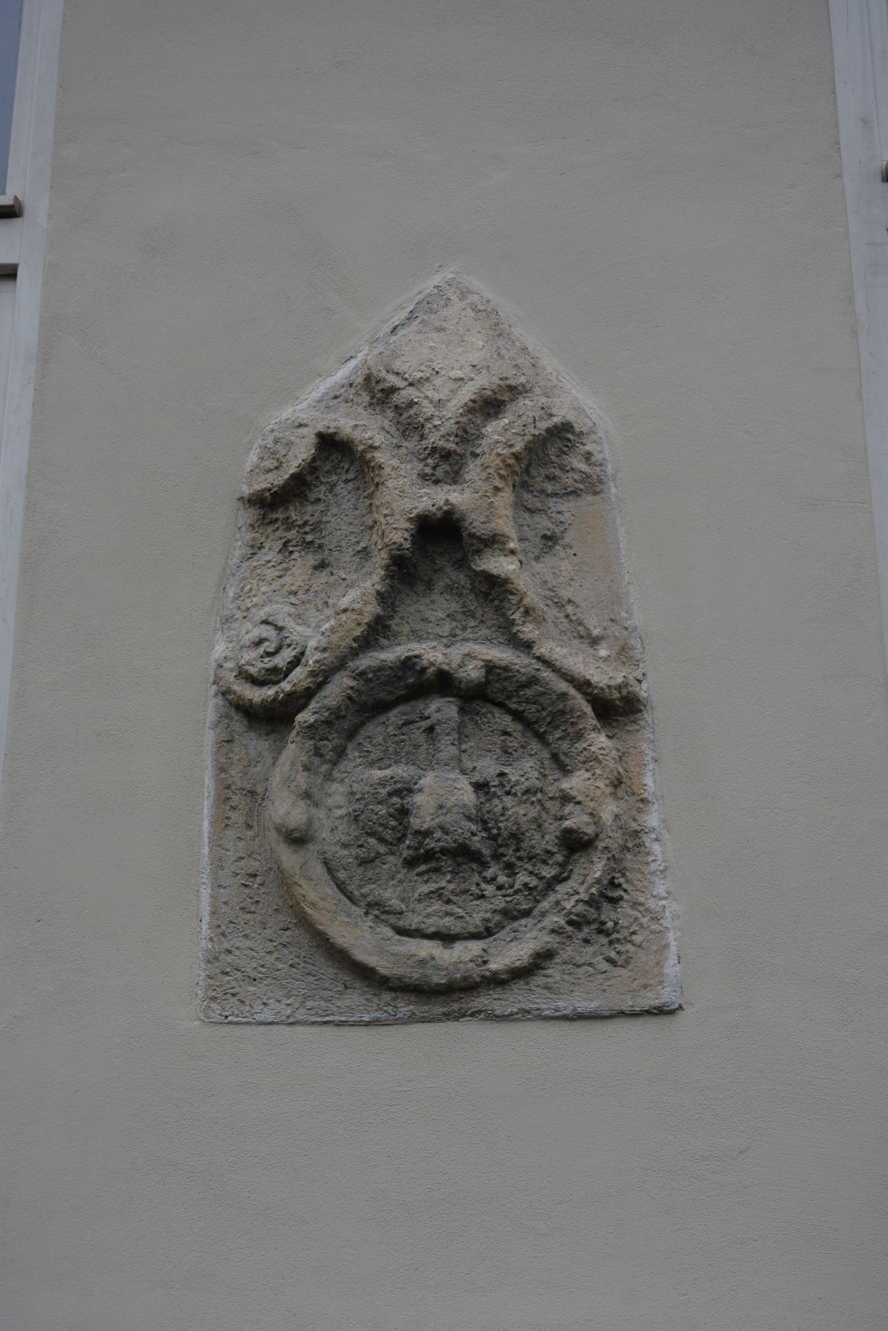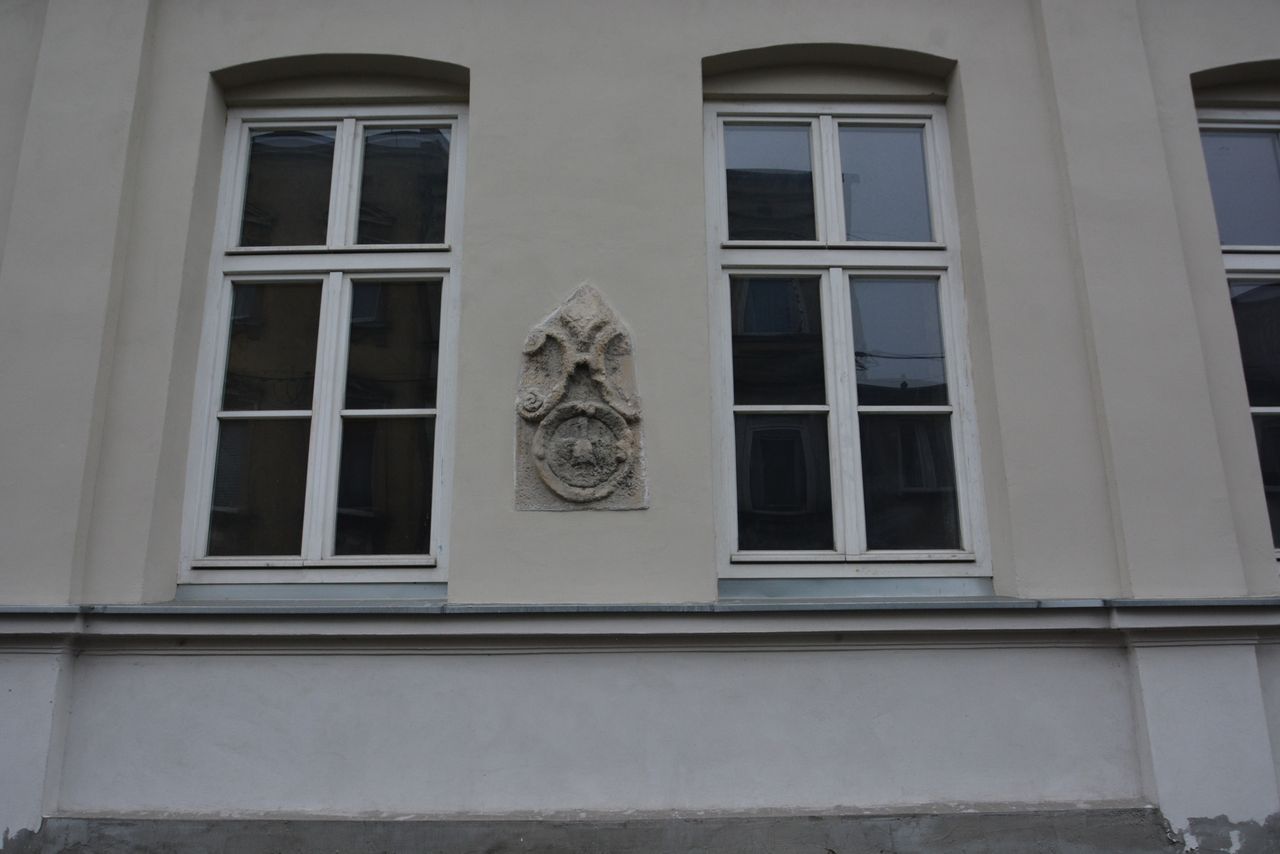 Gmerki to znaki osobiste i rodzinne mieszczan, niekiedy również i zamożnych chłopów. Zdobiły ich domy, jak również pieczęcie i sygnety. Nasz gmerk ma postać płaskorzeźby o kształcie odwróconego ryngrafu lub tarczy rycerskiej, na której umieszczono ozdobnie wykonaną literę H. Poniżej znajduje się okrągły wieniec z orłem pośrodku. Nad rozchylonymi ramionami litery H zaznacza się niewyraźnie coś w rodzaju litery V. Litera H może oznaczać inicjał imienia Hinco (Janko), litera V może być pierwszą literą wyrazu „Vogt” – z niemieckiego wójt, a znak orła można odczytać jako symbol władzy.
