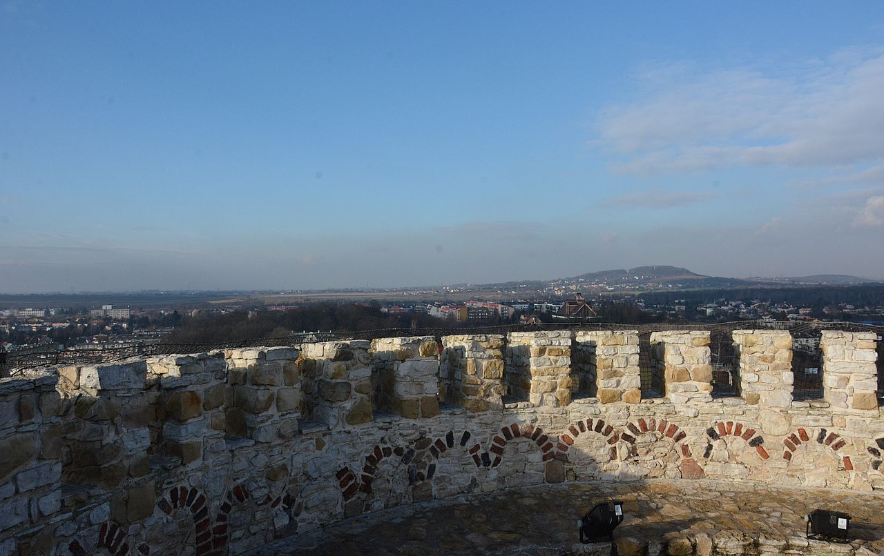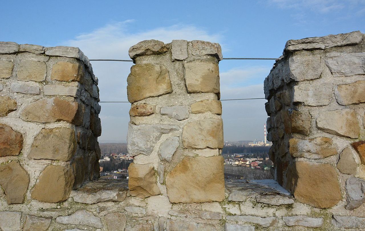 Łatwo zauważyć, że okrągła wieża (stołp) będzińskiego zamku zwieńczona jest blankami, czyli krenelażem.