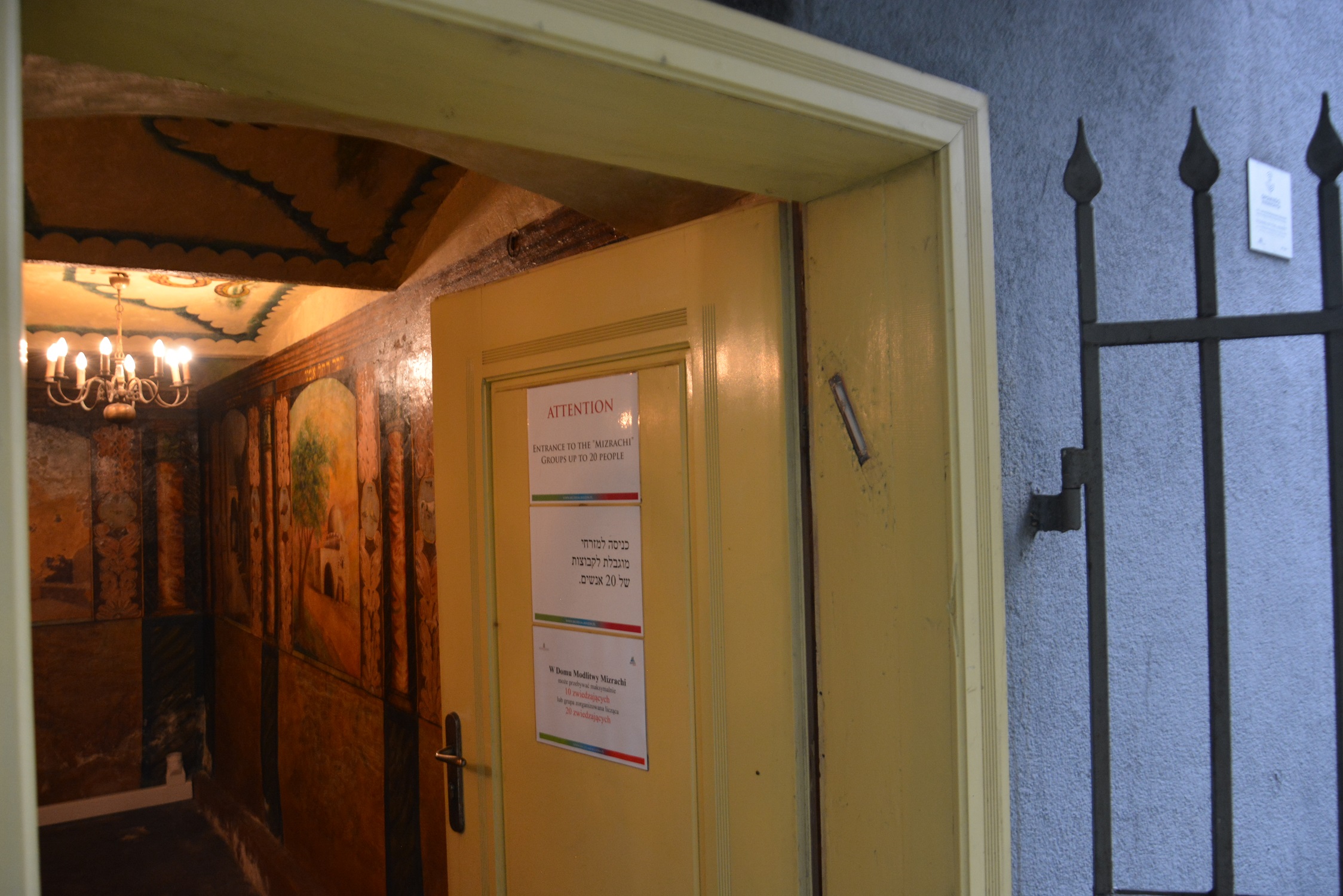 Przy wejściu do domu modlitwy Mizrachi, na futrynie po prawej stronie, znajduje się mały, przeźroczysty pojemnik w kształcie rurki zawierający pergamin. To mezuza - pudełko wykonywane z rozmaitych materiałów, np. z drewna, szkła, ceramiki, plastiku czy metalu, w którym umieszczono kawałek pergaminu z naniesionymi odręcznie dwoma fragmentami Tory. Pojemniki mogą mieć różnorodne formy - od prostej rurki, jak ta w Mizrachi, po misternie zdobione skrzynki wykonane z ozdobnych materiałów, z popularnymi motywami żydowskimi. Słowo mezuza w języku hebrajskim oznacza „odrzwia”, a w dosłownym tłumaczeniu „słupek drzwi”.