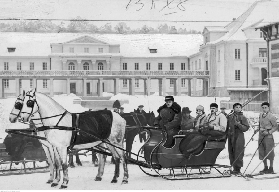 4. Budynek Nowych Łazienek. Na pierwszym planie widoczni kuracjusze w saniach i narciarze, 1930 r., NAC.