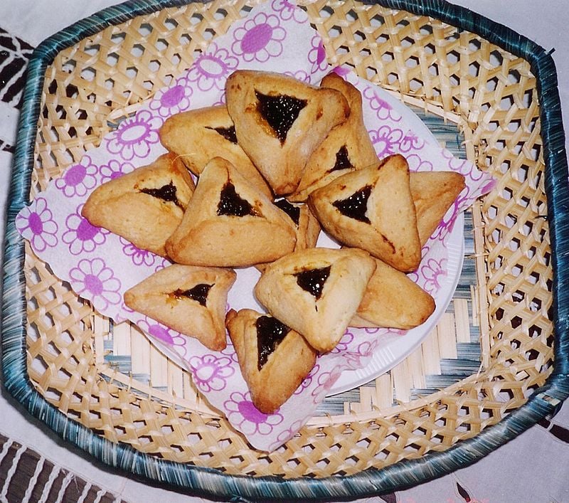Ciasteczka purimowe – źródło https://upload.wikimedia.org/wikipedia/commons/2/2b/Homemade_hamantaschen_%28cropped%29.jpg