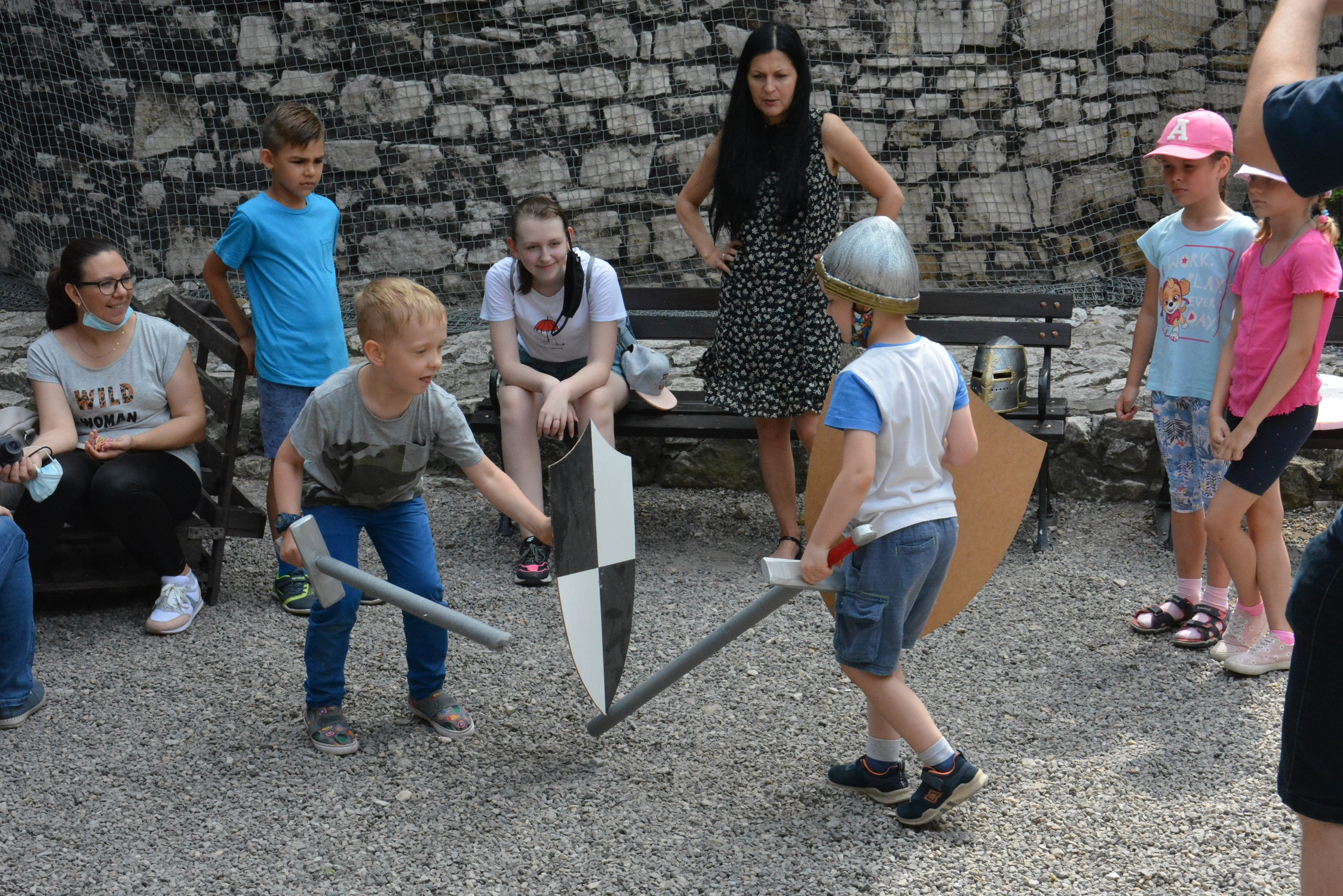 Trzeba było wykazać się wiedzą i spostrzegawczością, np. dobrze przypatrzyć się zdobieniom na broni zamkowej, „uporządkować” zbiory zamkowe i pałacowe, wskazać zmiany jakie zaszły w bryle zamku od czasów Mathiasa Gerunga, który uwiecznił Będzin na XVI-wiecznej weducie czy na przykład zademonstrować potyczkę  rycerzy. Skarbem ukrytym w kasie zamkowej okazały się pamiątki muzealne. Emocji było dużo a dzień naprawdę upalny. Ochłodę nasza dzielna drużyna poszukiwaczy skarbu znalazła w Podziemiach będzińskich, gdzie wraz z przewodnikiem zwiedzała podziemne korytarze poznając ciekawą historię tego obiektu.