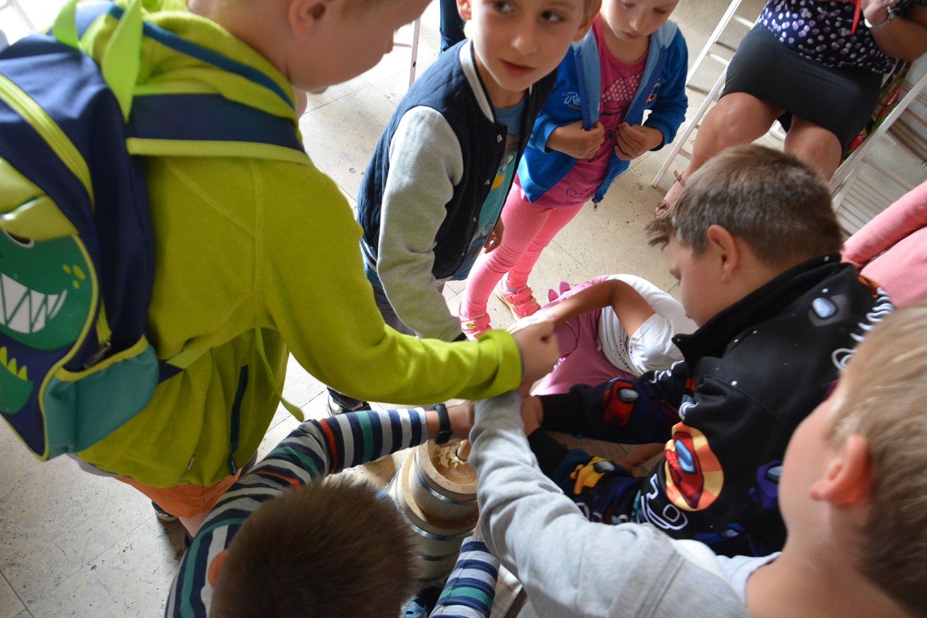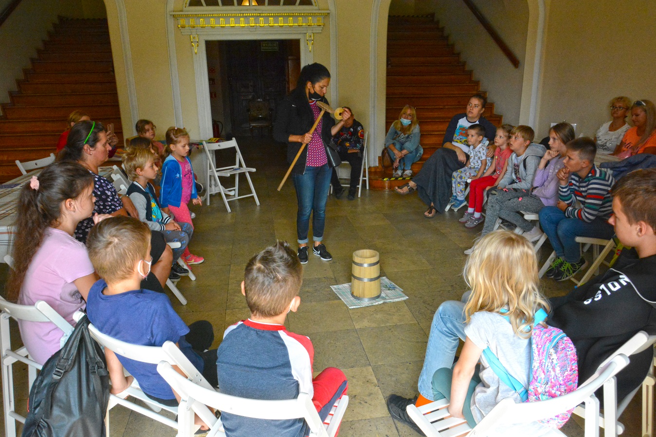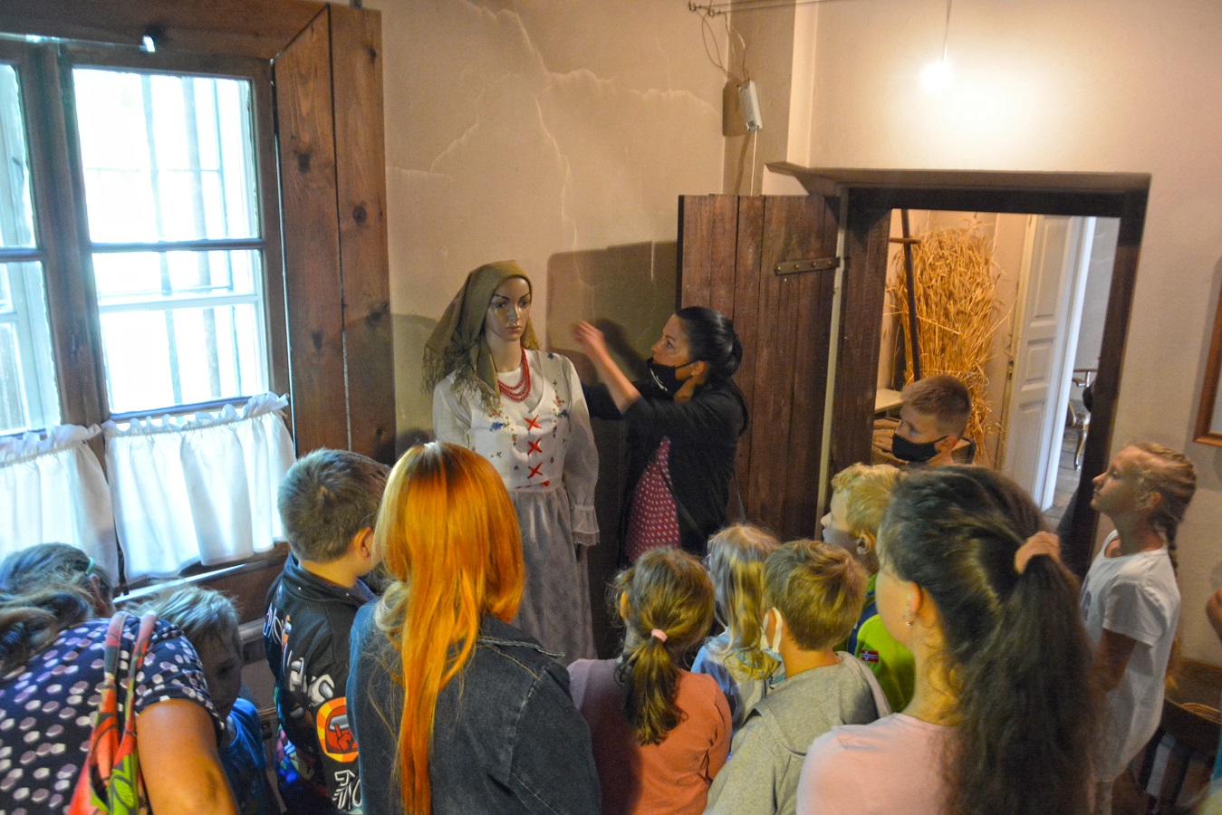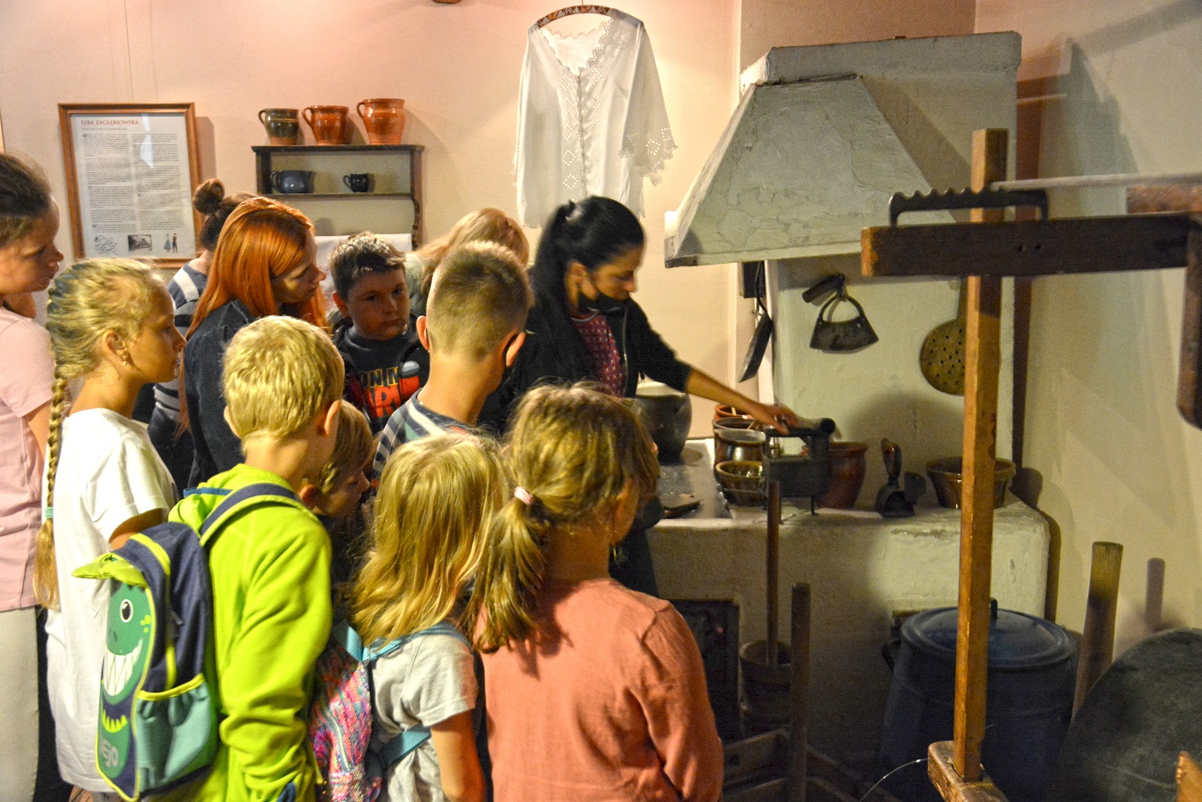 Pierwsza cześć dzisiejszego spotkania miała przybliżyć wybrane zagadnienia związane z kulturą ludową Zagłębia Dąbrowskiego. Rozpoczęto zatem od zwiedzania wystawy etnograficznej pn. „Izba zagłębiowska”, gdzie dzieci dowiedziały się, jak kiedyś wyglądało życie codzienne w wiejskiej chacie (przełom XIX i XX w.) - tradycyjne zajęcia ludności, wnętrze izby i sprzęt gospodarstwa domowego, tradycyjne potrawy, a także stroje naszych dziadków i pradziadków. Poznały też zasadę działania krosna poziomego. Następnie z wielkim entuzjazmem zabrały się do samodzielnego ubijania masła w maselnicy bednarskiej roboty. Wspólne ubijanie było też okazją do rozmowy o tym, jak ciężko żyło się kiedyś ludziom na wsi i jakie były zalety życia w tamtych czasach. Całość zakończyło „uroczyste otwarcie” maselnicy. Oczom zebranych ukazało się ubite masło i maślanka – zajęcia skończyły się zatem sukcesem.