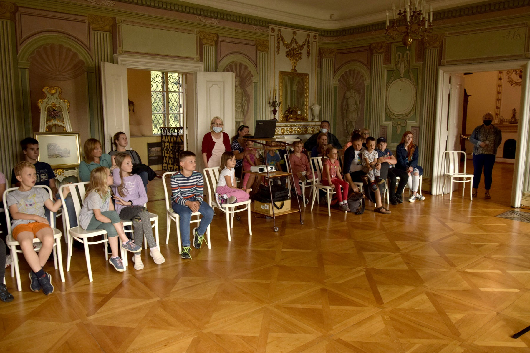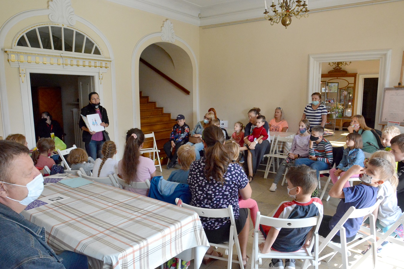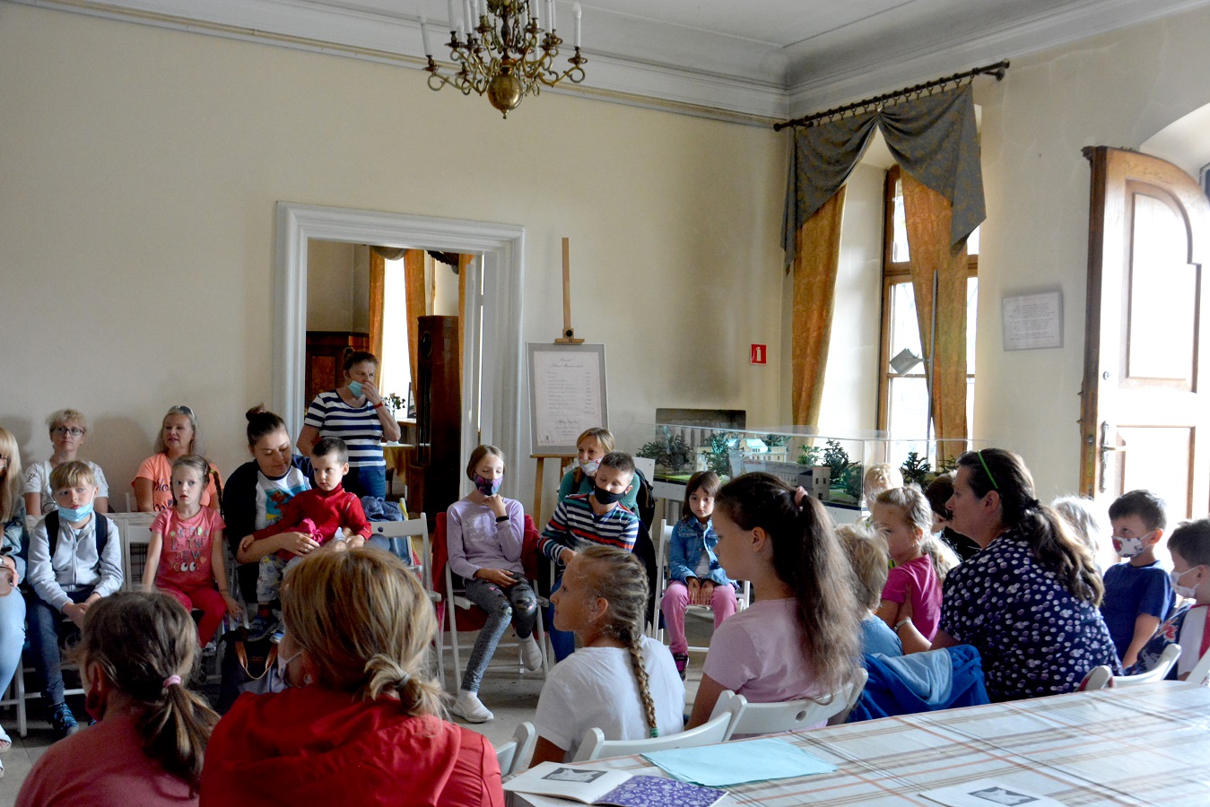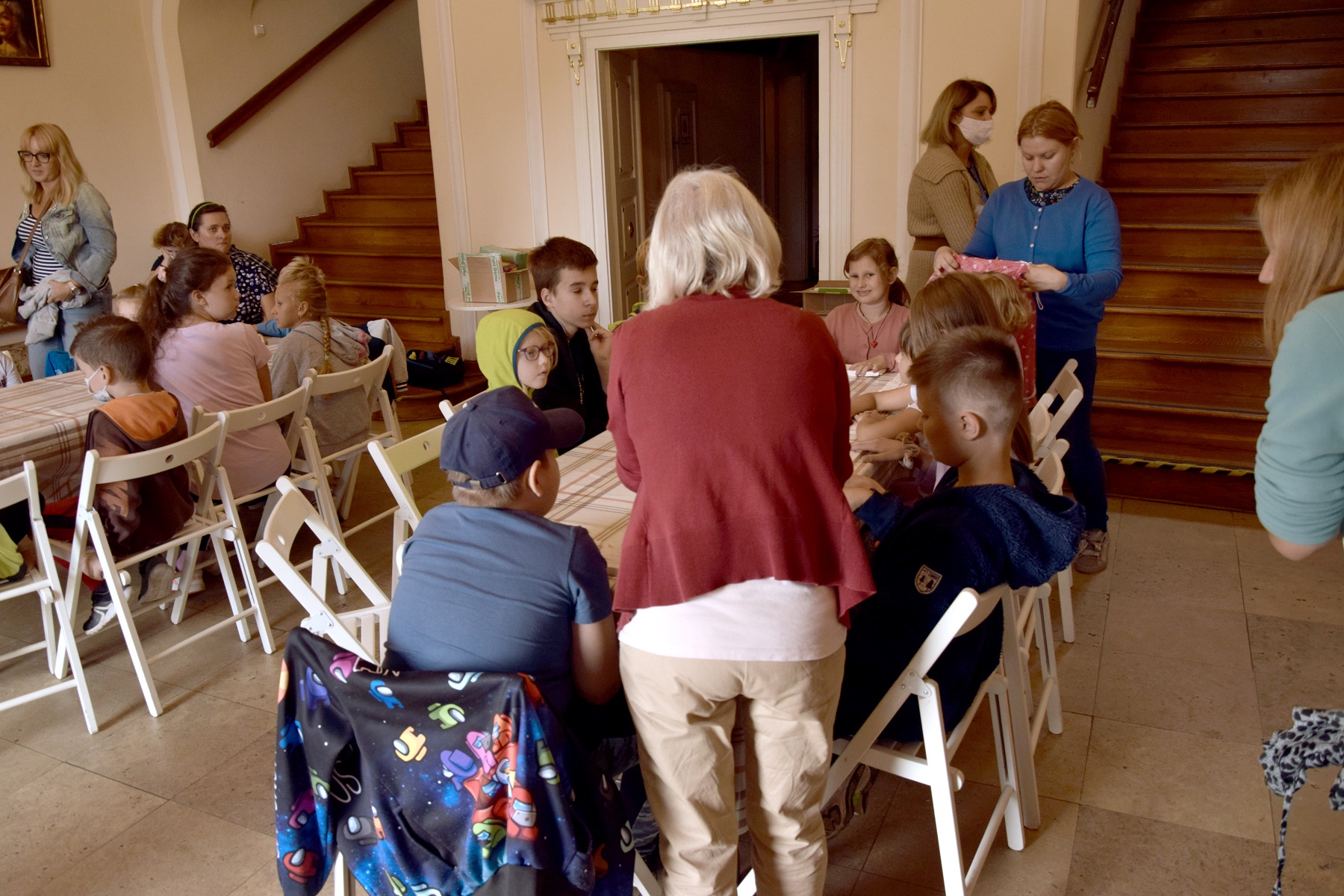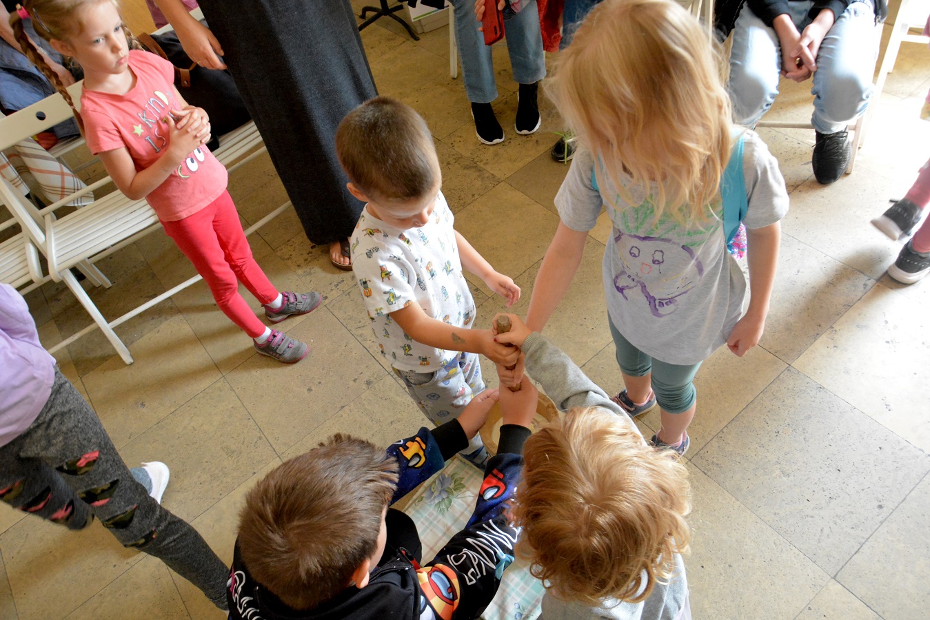 Pierwsza cześć dzisiejszego spotkania miała przybliżyć wybrane zagadnienia związane z kulturą ludową Zagłębia Dąbrowskiego. Rozpoczęto zatem od zwiedzania wystawy etnograficznej pn. „Izba zagłębiowska”, gdzie dzieci dowiedziały się, jak kiedyś wyglądało życie codzienne w wiejskiej chacie (przełom XIX i XX w.) - tradycyjne zajęcia ludności, wnętrze izby i sprzęt gospodarstwa domowego, tradycyjne potrawy, a także stroje naszych dziadków i pradziadków. Poznały też zasadę działania krosna poziomego. Następnie z wielkim entuzjazmem zabrały się do samodzielnego ubijania masła w maselnicy bednarskiej roboty. Wspólne ubijanie było też okazją do rozmowy o tym, jak ciężko żyło się kiedyś ludziom na wsi i jakie były zalety życia w tamtych czasach. Całość zakończyło „uroczyste otwarcie” maselnicy. Oczom zebranych ukazało się ubite masło i maślanka – zajęcia skończyły się zatem sukcesem.