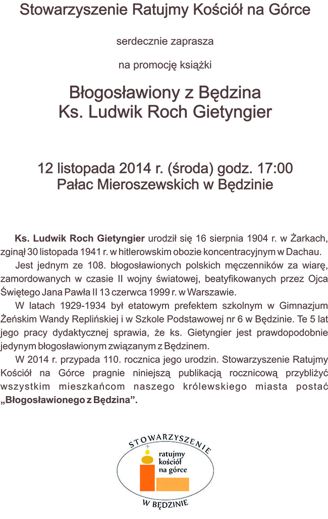Błogosławiony z Będzina Stowarzyszenie Ratujmy Kościół na Górce zaprasza na promocję książki "Błogosławiony z Będzina Ks. Ludwik Roch Gietyngier", która odbędzie się w środę 12 listopada o godzinie 17.00 w Pałacu Mieroszewskich.