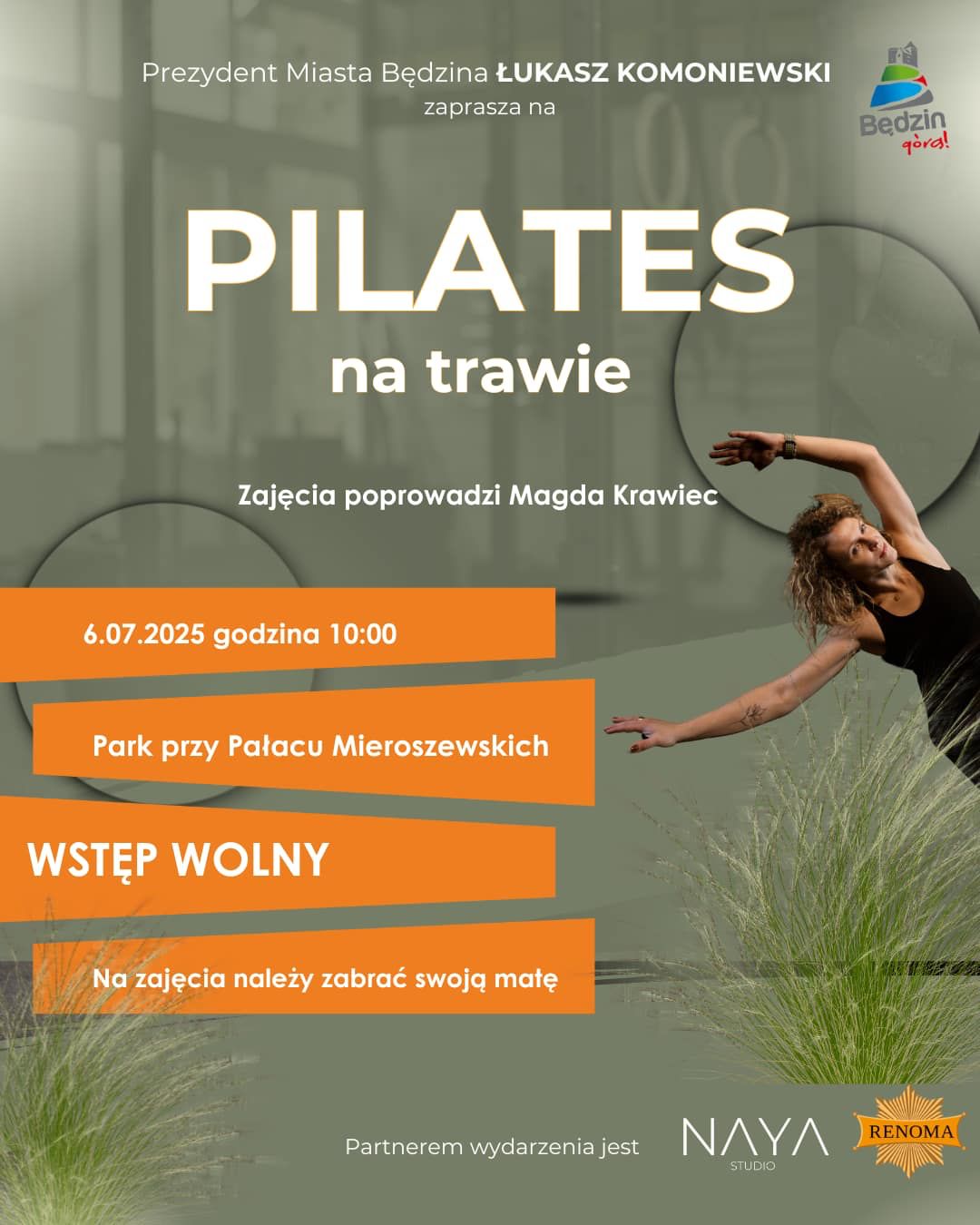 Zapraszamy na bezpłatne zajęcia Pilates na trawie w pięknym otoczeniu parku przed Pałacem Mieroszewskich.