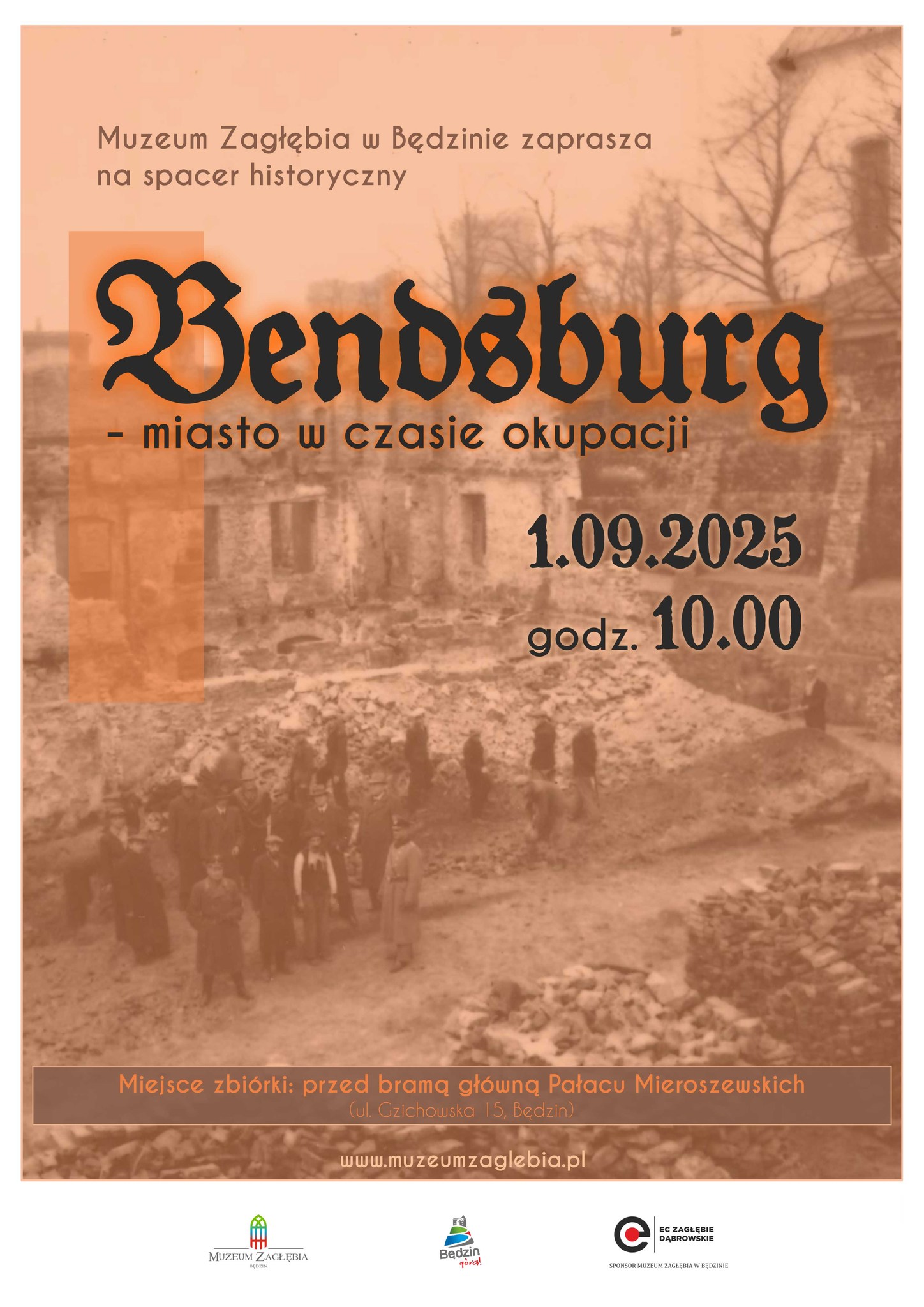 Zachęcamy do udziału w wyjątkowym spacerze historycznym po Będzinie, którego celem jest przybliżenie wydarzeń z okresu II wojny światowej – poprzez miejsca pamięci, wspomnienia bohaterów i losy zwykłych mieszkańców naszego miasta.