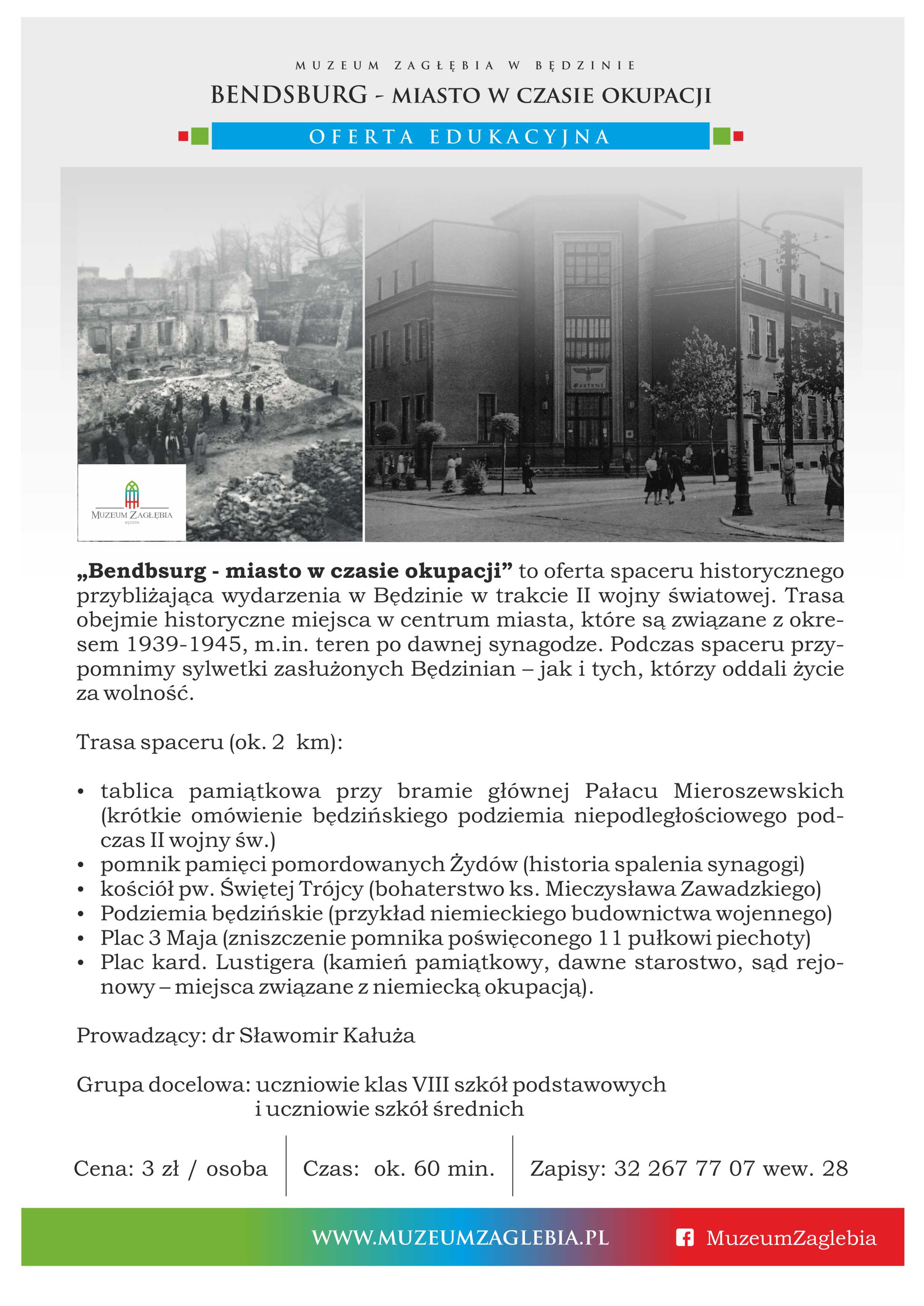W dniach 1 i 4 września odbyły się spacery historyczne pt. "Bendsburg - miasto w czasie okupacji". Uczestnicy wydarzenia odwiedzili miejsca w centrum Będzina związane z okresem II wojny światowej, poznali mało znane wątki dotyczące m.in. ruchu oporu i działalności niemieckich dywersantów.