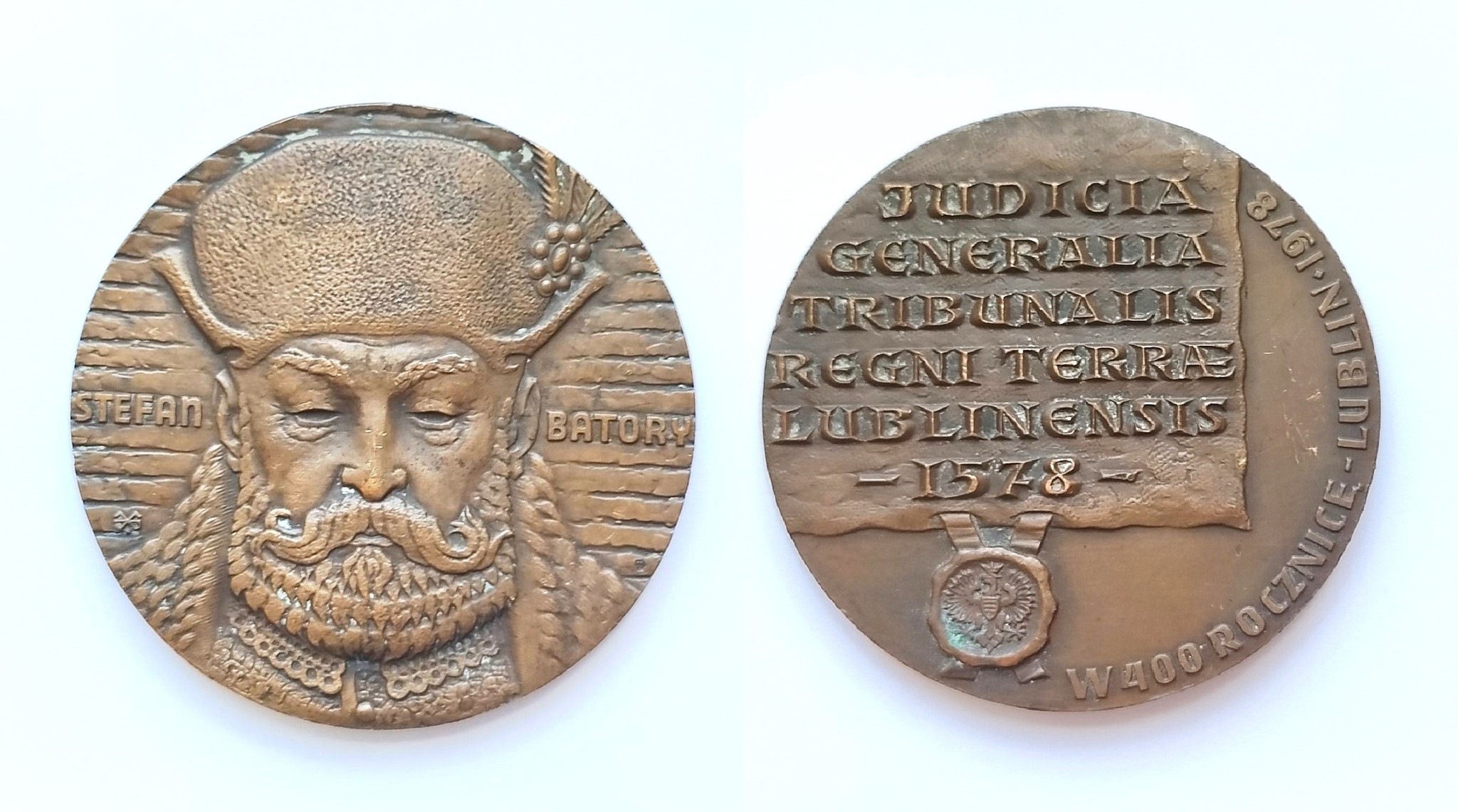 Ilustracja: Awers i rewers medalu z przedstawieniem króla Stefana Batorego, wykonany z okazji 400. rocznicy powołania Trybunału Koronnego; projekt: Edward Gorol, materiał: tombak, 1978 r. Zbiory Muzeum Zagłębia w Będzinie.