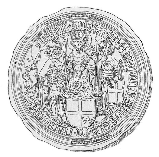 Ilustracja: Odcisk pieczętny biskupa Zbigniewa Oleśnickiego z 1438 r. według ilustracji z pracy Jana Sygańskiego „Historya Nowego Sącza od wstąpienia dynastii Wazów do pierwszego rozbioru Polski”, t. 3: „Zabytki dziejowe miasta”, Lwów 1902, tab. X. Domena publiczna.