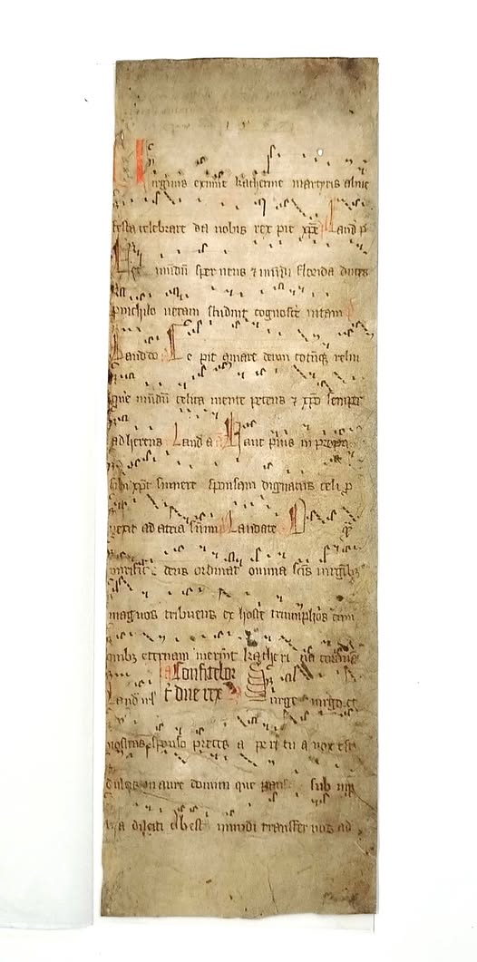 Ilustracja: Karta pergaminowa z zapisem pieśni „Virginis eximiae”, 1567 r. Zbiory Muzeum Zagłębia w Będzinie.