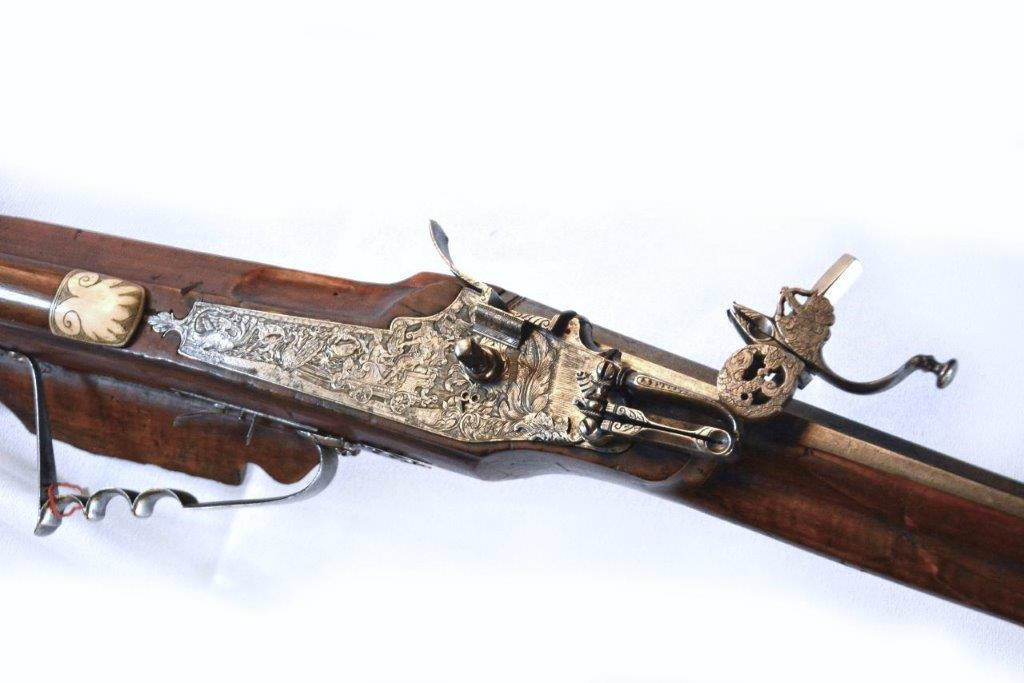 Do grupy wyjątkowo misternie zdobionych muzealiów zalicza się prezentowany arkebuz. Szczególną uwagę zwracają niezwykle bogate i szczegółowe nawiązania do mitologii greckiej umieszczone na płycie zamka. Broń została wykonana w warsztacie praskiego mistrza rusznikarskiego Hansa Stiftera, znanego z produkcji oręża o wysokim poziomie zdobnictwa, które trafiało m.in. na dwory w Wiedniu i Dreźnie. Dzisiaj arkebuz może cieszyć oczy zwiedzających wystawę stałą w naszym Zamku.