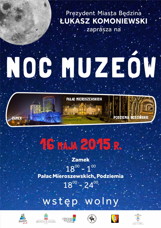 Muzeum Zagłębia w Będzinie zaprasza na „Noc Muzeów”, która odbędzie się w naszych obiektach 16 maja 2015 r. W ramach tej międzynarodowej imprezy muzea europejskie przyjmują zwiedzających w nietypowych, nocnych godzinach. Organizatorzy przygotowują również wiele dodatkowych atrakcji np. koncerty, występy, pokazy. Muzeum Zagłębia  również przygotowało dla naszych gości wiele niespodzianek.