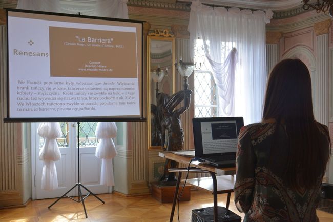 Podczas prezentacji multimedialnej słuchacze zapoznali się z historią tańca od średniowiecza do XIX w., a także przybliżone zostały dobre maniery związane z dawną zabawą taneczną. W części praktycznej prelegentka wprowadziła studentów w arkana tańców renesansowych i barokowych, które następnie wspólnie wykonali. Oprawę całych zajęć stanowiły piękne polichromie w Sali Wodzów Antycznych Pałacu Mieroszewskich.
