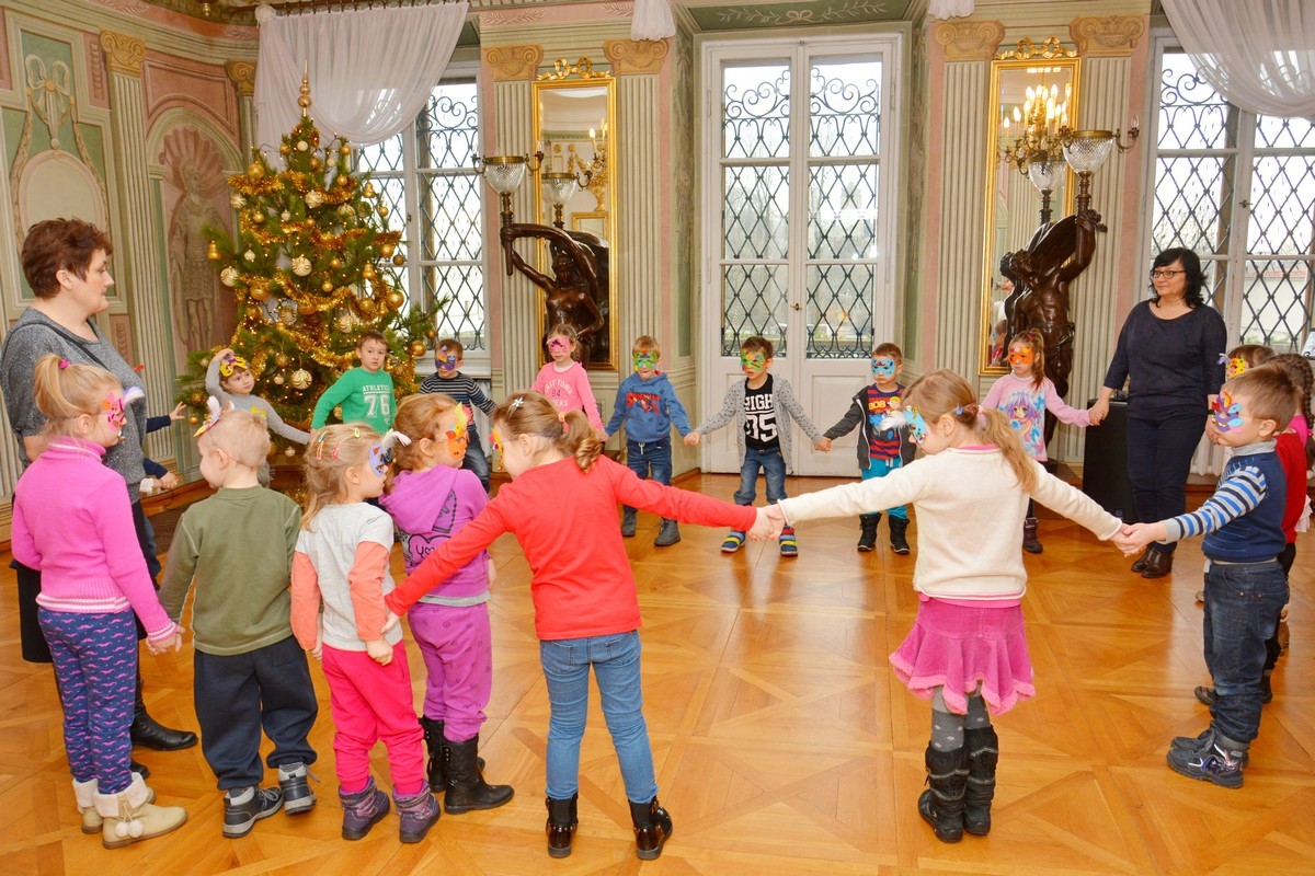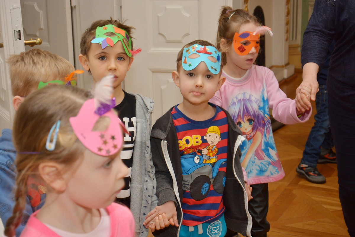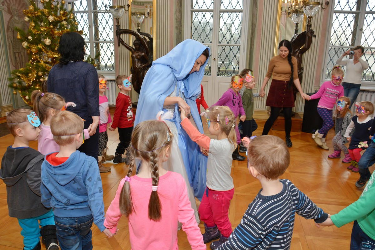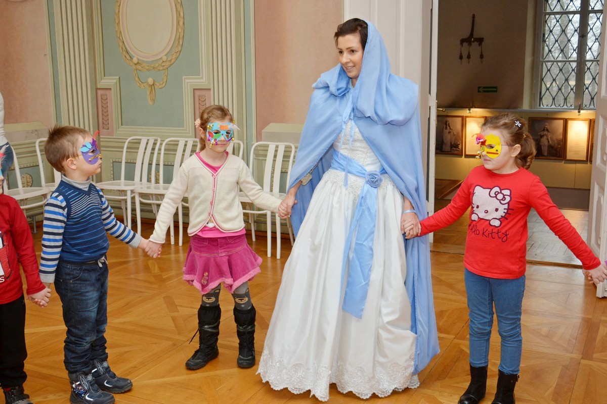 Podczas zajęć dzieci dowiedziały się jak dawniej spędzano czas podczas karnawału. Następnie z pomocą prowadzących Anny Góry i Małgorzaty Hałasik uczestnicy wykonali maski karnawałowe, które stały się nieodłącznym elementem zabawy tanecznej w Sali Wodzów Antycznych naszego pałacu. Ku uciesze wszystkich milusińskich do zabawy dołączyła Błękitna Ludwika, co utrwalił nasz fotograf - Bartosz Gawlik.