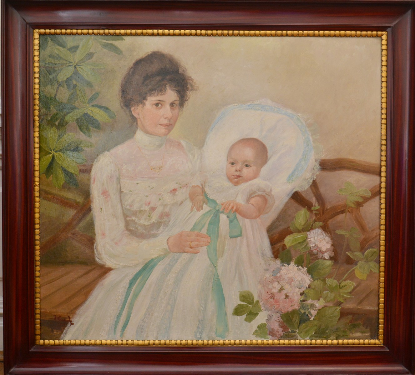 Wzrok widza przyciąga maleńkie dziecko w odświętnej szatce z długą, seledynową szarfą. Niemowlę jest trzymane na rękach kobiety ubranej w jasną, elegancką bluzkę lub suknię, przyozdobioną koronkami. Nieznany twórca, malując piękne detale stroju kobiety wraz ze złotym, secesyjnym naszyjnikiem, stworzył bardzo dostojne ujęcie portretowe. Dzięki temu zabiegowi oraz jasnej i świeżej kolorystyce obraz głosi światu radość narodzin dziecka.