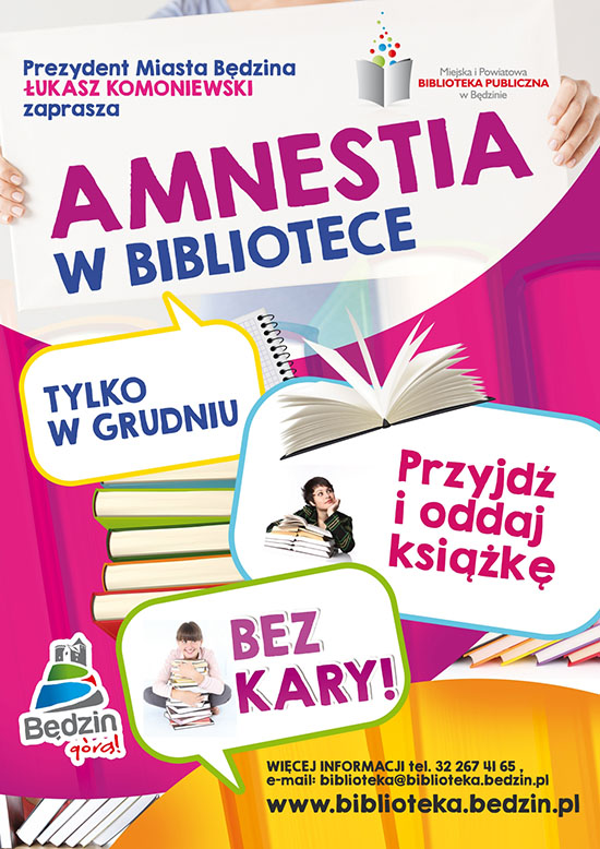 Będzińska książnica informuje, że w grudniu każdy Czytelnik może uregulować zobowiązania wobec biblioteki i zwrócić zaległe książki oraz inne materiały biblioteczne bez ponoszenia konsekwencji regulaminowych.