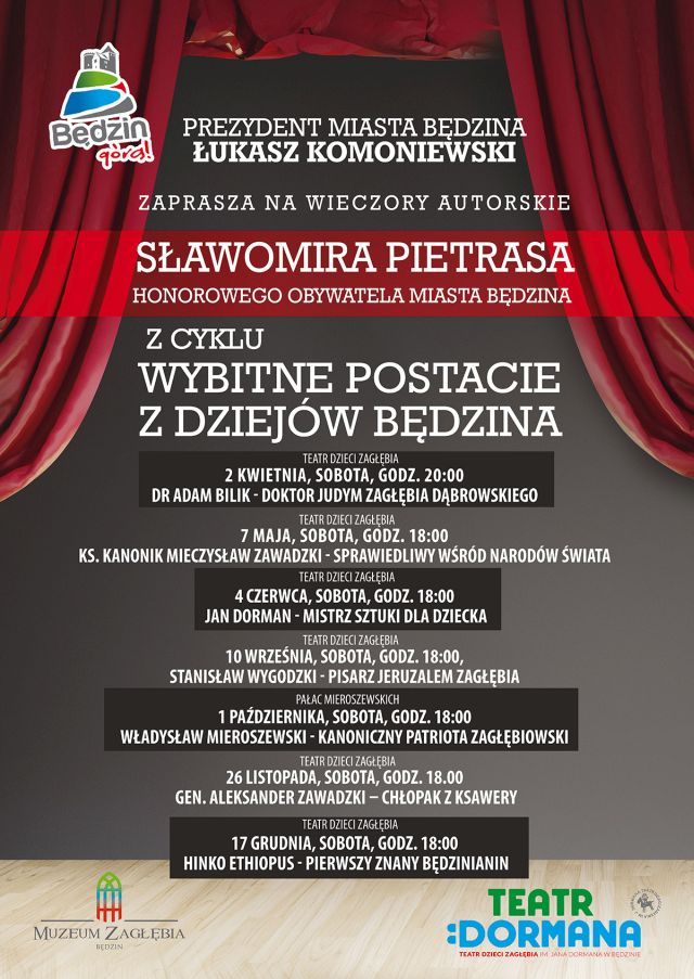 Prezydent Miasta Będzina Łukasz Komoniewski zaprasza na cykl wieczorów autorskich honorowego obywatela Będzina Sławomira Pietrasa na temat wybitnych postaci z dziejów Będzina.