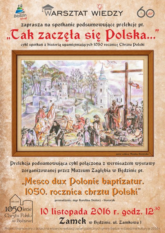 Fundacja „Warsztat Wiedzy” wraz z Muzeum Zagłębia w Będzinie mają zaszczyt zaprosić Państwa na ostatnią już prelekcję związaną z 1050. rocznicą chrztu Polski. Prelekcja będzie połączona z wernisażem wystawy pt. „Mesco dux Polonie baptizatur. 1050. rocznica chrztu Polski” i odbędzie się 10 listopada 2016 roku o godzinie 12:30 w Zamku.