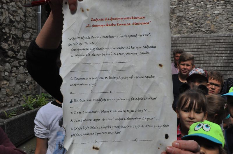 W starodawnej butli sprzed wieków, ukrytej na dziedzińcu zamkowym, dzieci uczestniczące w dzisiejszym spotkaniu znalazły list od, znanego z legendy, burgrabiego będzińskiego -  Mikołaja Kornicza – Siestrzeńca.