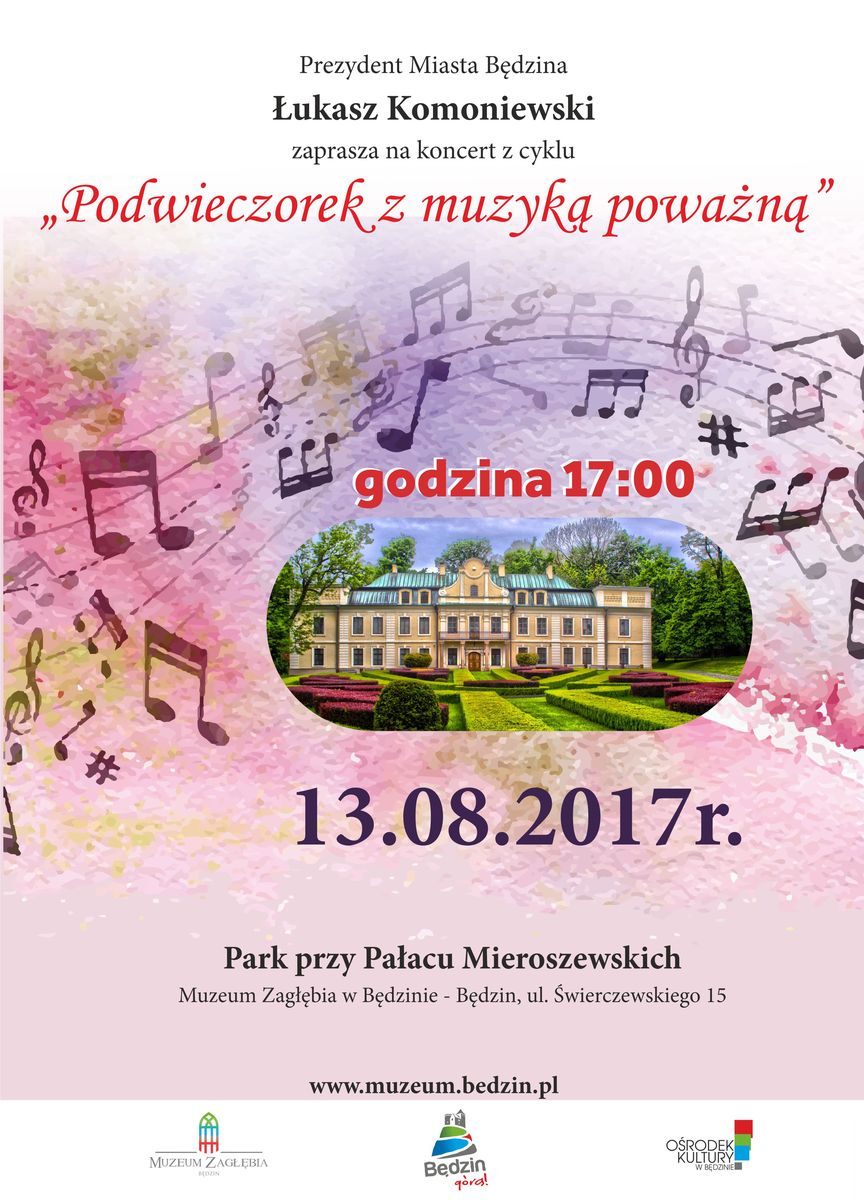 Prezydent Miasta Będzina Łukasz Komoniewski zaprasza na koncert z cyklu „Podwieczorek z muzyką poważną”, który odbędzie się 13 sierpnia o godzinie 17.00 w parku przy Pałacu Mieroszewskich, obok figur Bachusa i Flory.