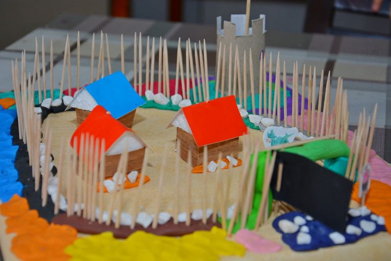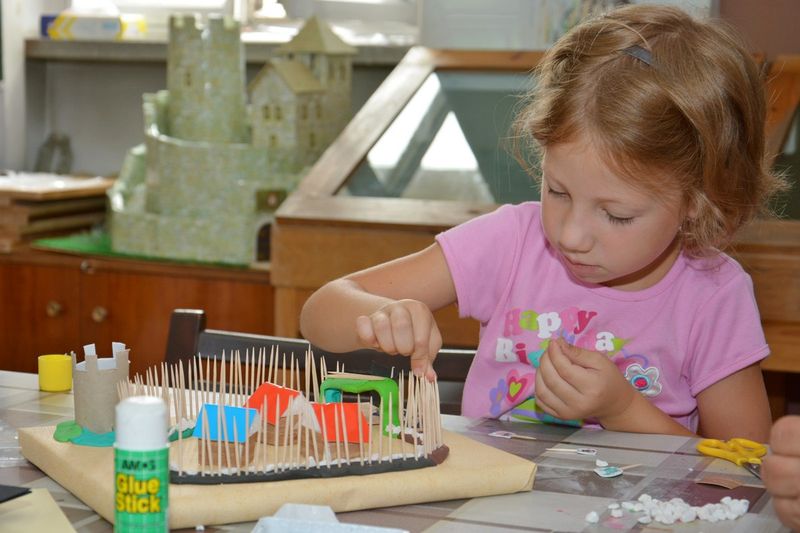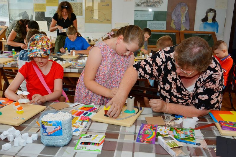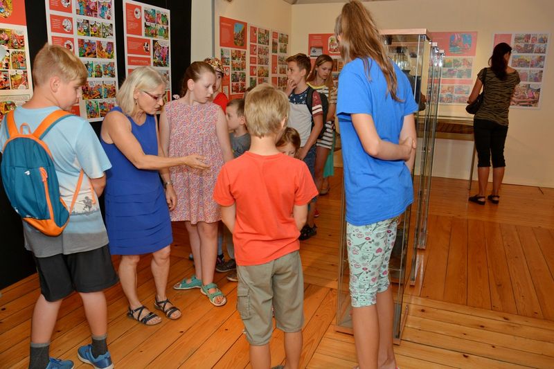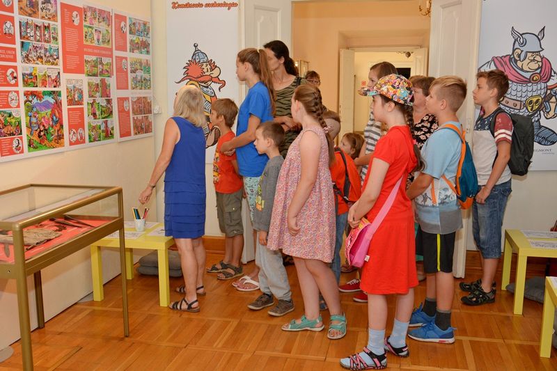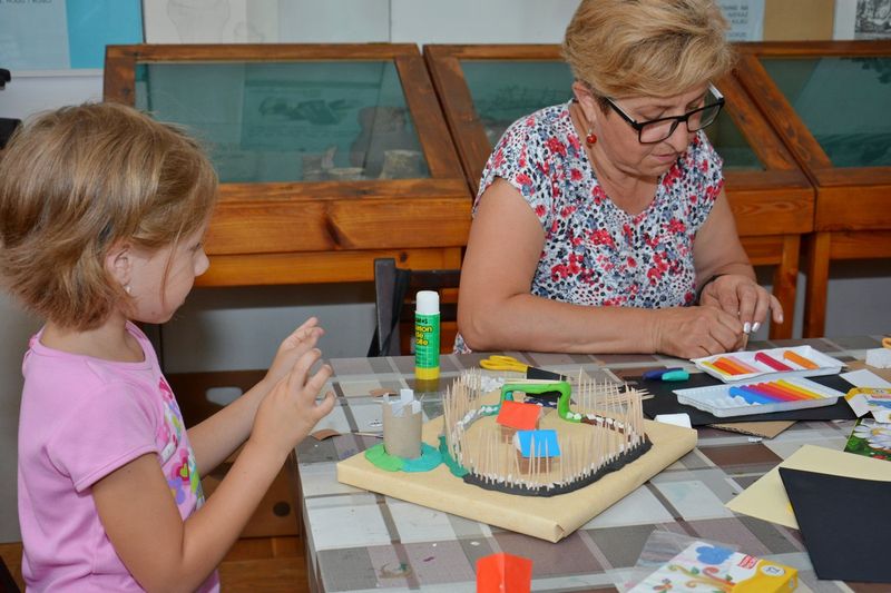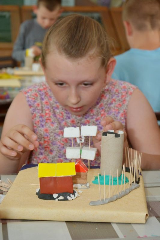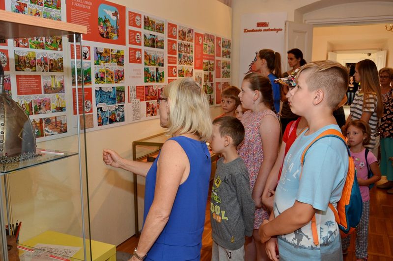 Przybyłe dzieci powitali Kajko i Kokosz na wystawie czasowej, która przyjechała z Muzeum Archeologicznego w Gdańsku. Po zapoznaniu się z losami dwóch dzielnych wojów księcia Mirmiła z komiksu Janusza Christy, zebrani podążyli na piętro pałacu, gdzie czekała ich kolejna porcja "nauki przez zabawę". Prezentacja komputerowa wyjaśniła im czym były średniowieczne grody, jak, kiedy i dlaczego je budowano, oraz co z nich pozostało, zarówno w terenie, jak i w sferze coraz żywszej w ostatnich latach tradycji "średniowiecznych grup rekonstrukcyjnych". Na koniec tej części zajęć w sali warsztatowej mogły zbudować własne Mirmiłowo z materiałów modelarskich dotowanych przez Oddział Górnośląski SNAP. Po zajęciach warsztatowych zaplanowano zwiedzanie ekspozycji zamkowej. W czasie zwiedzania wystawy „Dawna Broń” nasi goście zapoznali się z tajnikami broni białej i palnej. Dowiedzieli się, jak działały różne rodzaje strzelb i pistoletów – lontowe, kołowe, skałkowe czy kapiszonowe, jak ładowało się taraśnice a także poznali tajniki władania mieczem, rapierem i szablą. Duże wrażenie na uczestnikach zajęć wywarła również prezentowana w Zamku wystawa czasowa „Magiczny realizm". Zapraszamy w kolejną sierpniową środę.