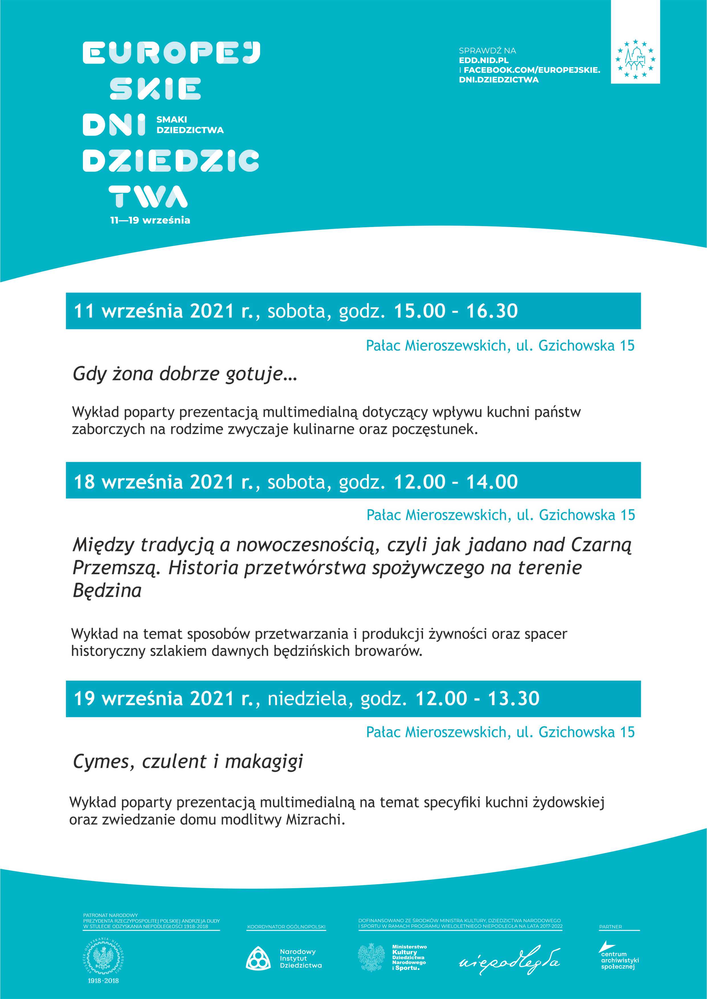 Zapraszamy do wzięcia udziału w Europejskich Dniach Dziedzictwa. Pierwsze z zaplanowanych spotkań odbędzie się 11 września 2021 r. w godz. 15.00 – 16.30 w Pałacu Mieroszewskich w Będzinie ul. Gzichowska 15.