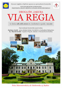 W sobotę 28 sierpnia w Pałacu Mieroszewskich odbyło się oprowadzanie kuratorskie po wystawie Droga św. Jakuba – VIA REGIA. W wydarzeniu uczestniczyli: Dariusz Jurek, prezes stowarzyszenia Forum dla Zagłębia Dąbrowskiego, autor odcinka szlaku na terenie Zachodniej Małopolski oraz ksiądz Marek Sendal, kapelan dróg św. Jakuba w diecezji sosnowieckiej, jednocześnie proboszcz parafii pod wezwaniem św. Jakuba Apostoła w Sączowie.