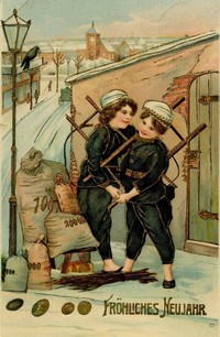 Na starych pocztówkach świątecznych oraz noworocznych częstym symbolem szczęścia jest kominiarz.
