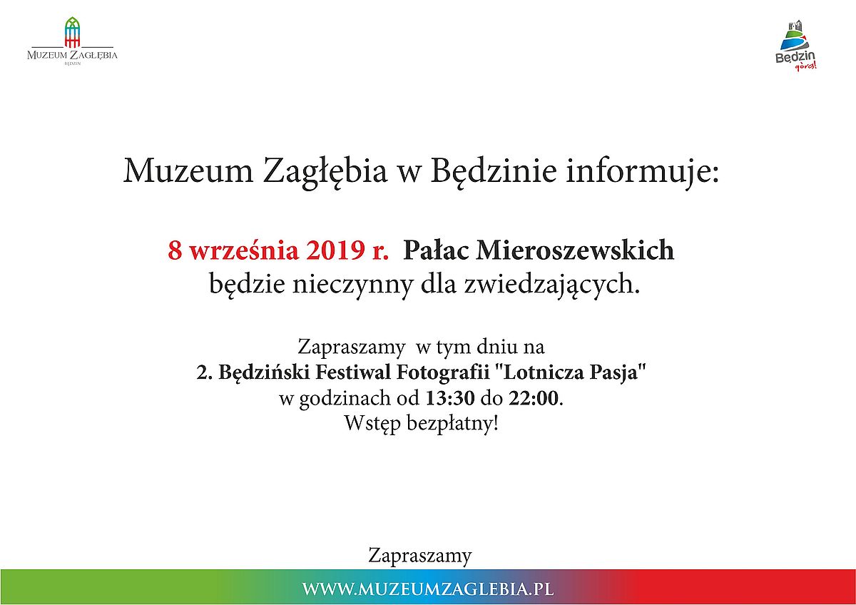 Kolejna edycja Będzińskiego Festiwalu Fotografii odbędzie się 8 września 2019 r. w Pałacu Mieroszewskich w Będzinie. Wydarzenie swoim honorowym patronatem objął Prezydent Miasta Będzina Łukasz Komoniewski.