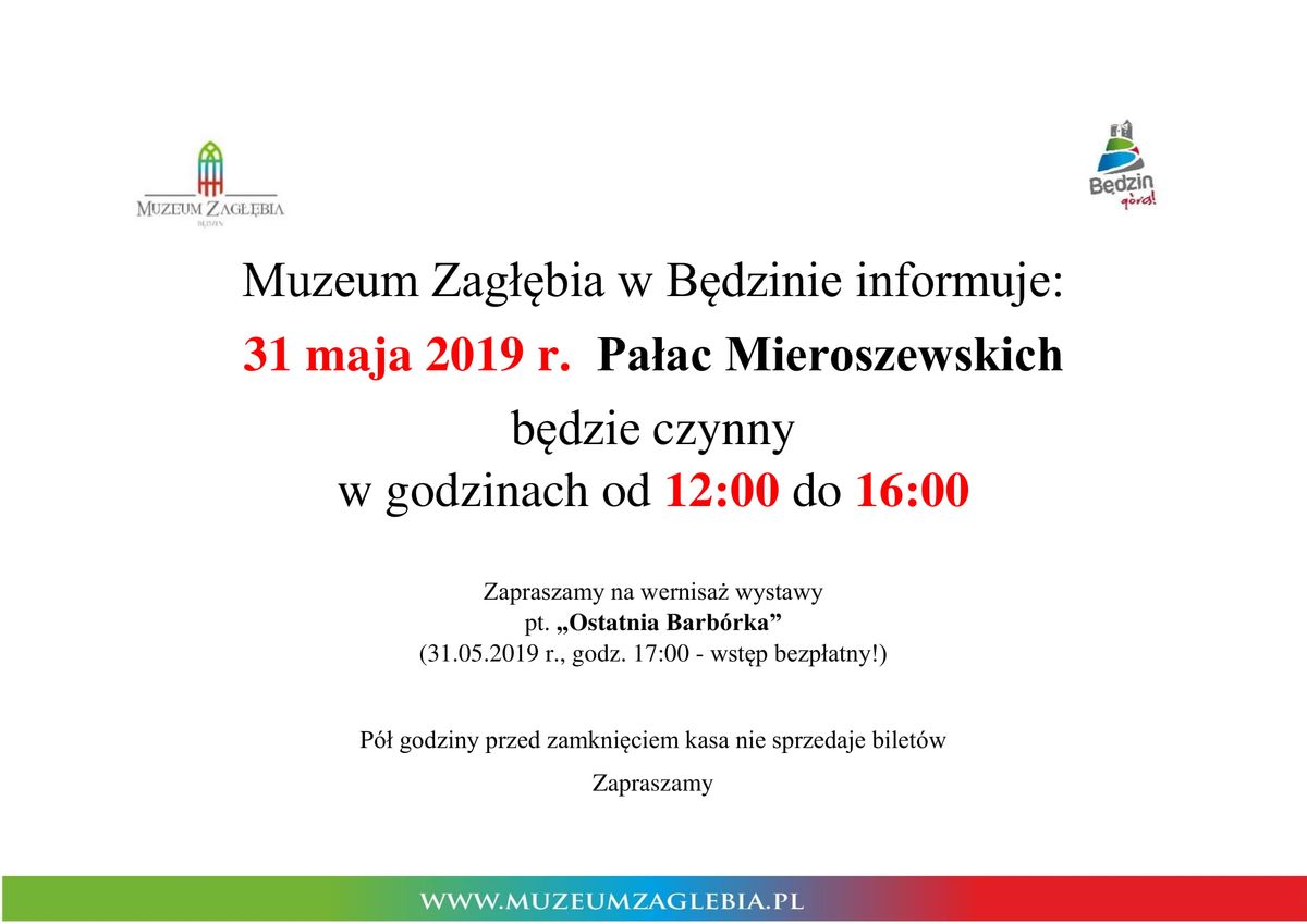 Serdecznie zapraszamy w najbliższy piątek 31 maja 2019 r. o godzinie 17:00 na wernisaż wystawy pt. „Ostatnia Barbórka - historia górnictwa węglowego w Zagłębiu Dąbrowskim”.