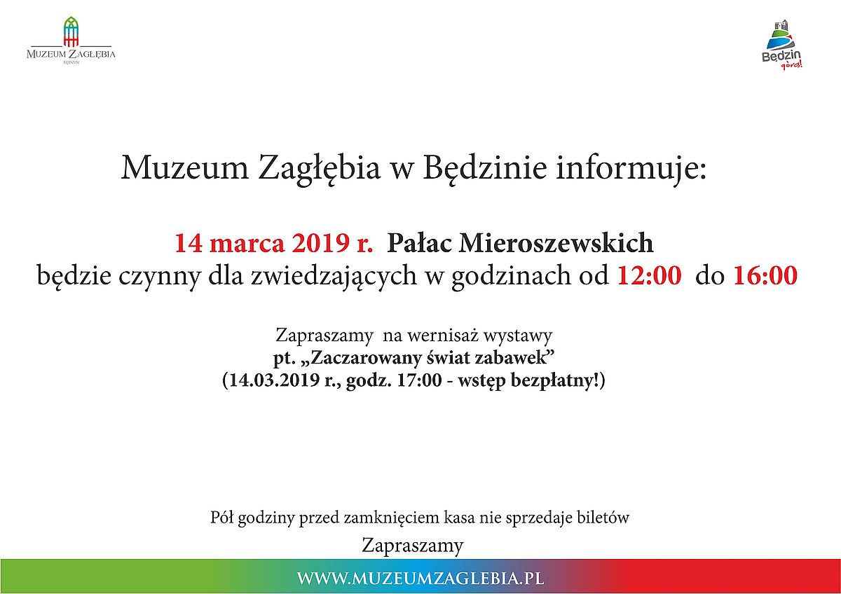 Muzeum Zagłębia informuje, że w dniu 16 marca 2019 roku (sobota), osoby, które wcześniej zakupią bilet na zwiedzanie Zamku, mogą nieodpłatnie skorzystać z oprowadzenia kuratorskiego na wystawie czasowej zatytułowanej „Znani Polacy na medalach ze zbiorów Muzeum Zagłębia w Będzinie. Z okazji stulecia odzyskania przez Polskę niepodległości”.