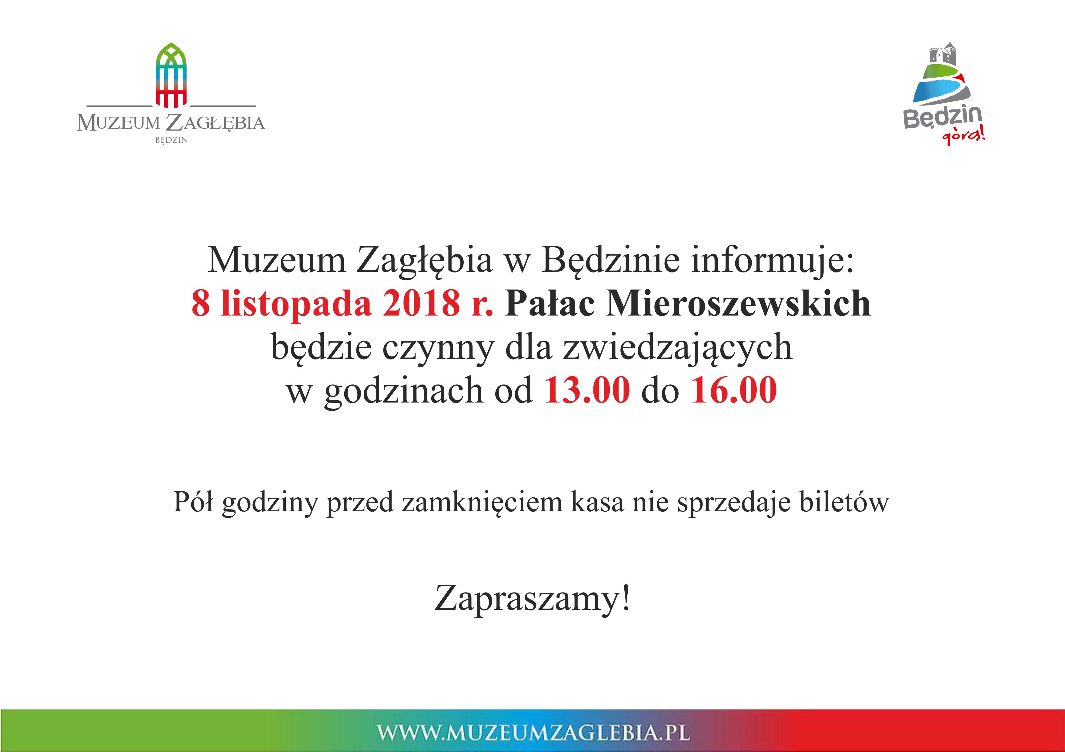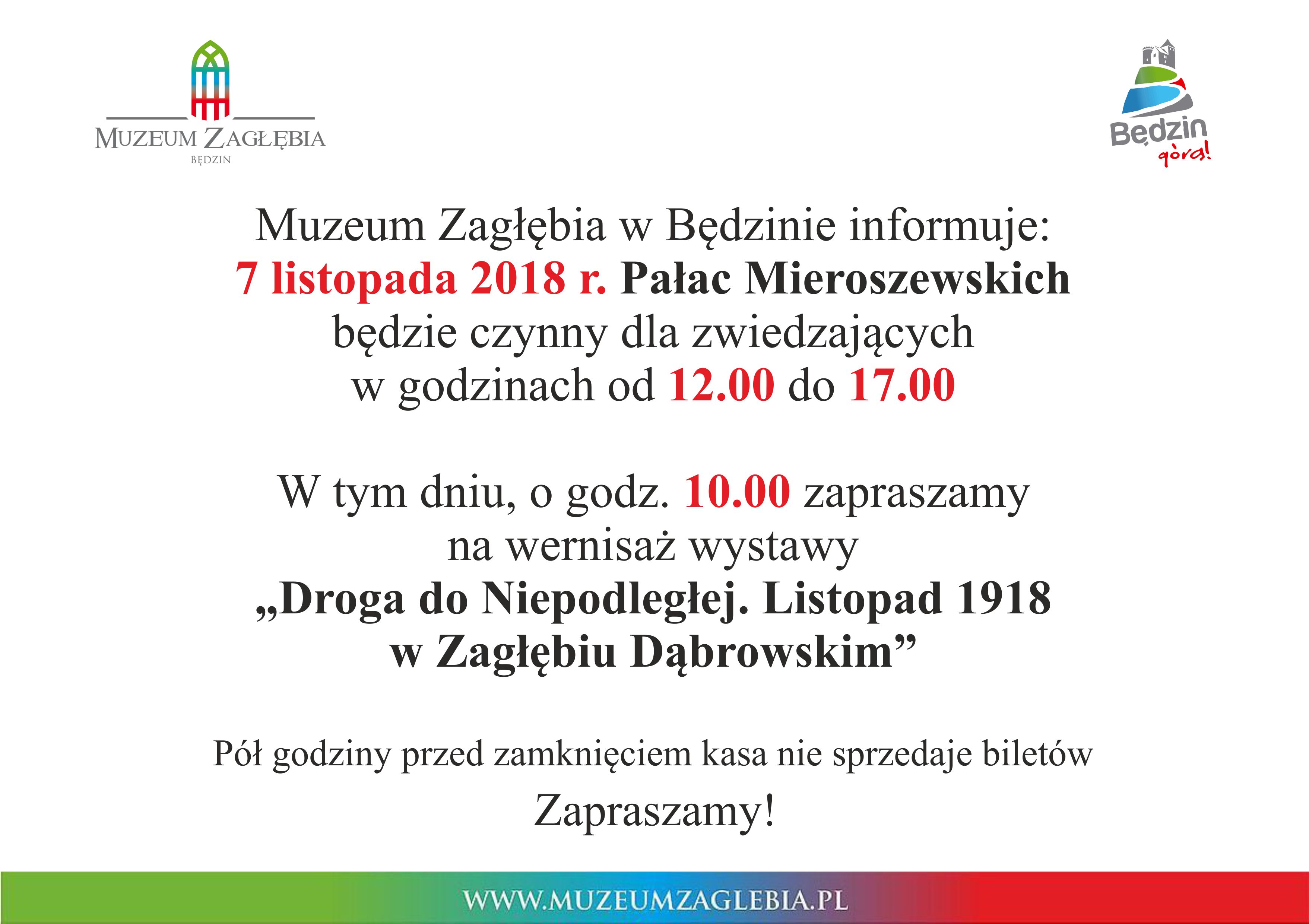 Prezydent Miasta Będzina Łukasz Komoniewski zaprasza na otwarcie wystawy „Droga do niepodległej. Listopad 1918 w Zagłębiu Dąbrowskim”, które odbędzie się 7 listopada 2018 r. o godz. 10.00 w Pałacu Mieroszewskich.