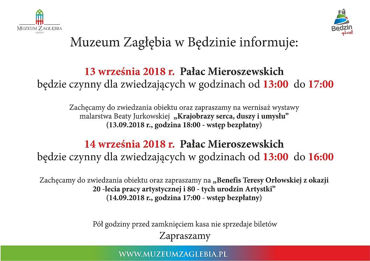 Informacja dot. godzin otwarcia Pałacu Mieroszewskich w dniach 13 i 14 września 2018 r.