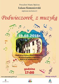 Prezydent Miasta Będzina Łukasz Komoniewski zaprasza na kolejny koncert z cyklu ”Podwieczorek z muzyką”, który odbędzie się 19 sierpnia 2018 r. o godzinie 17.00 w parku przy Pałacu Mieroszewskich.