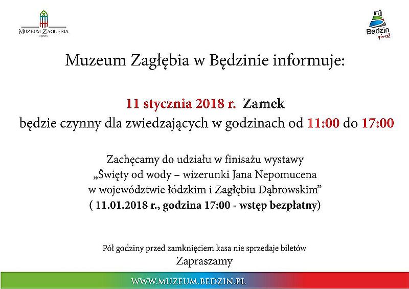 Muzeum Zagłębia w Będzinie zaprasza na finisaż wystawy „Święty od wody – wizerunki Jana Nepomucena w województwie łódzkim i Zagłębiu Dąbrowskim”, który odbędzie się 11 stycznia 2018 r. w Zamku o godzinie 17.00. Gościem finisażu wystawy będzie etnolog Andrzej Białkowski z Działu Dziedzictwa Kulturowego i Folkloru Regionów Łódzkiego Domu Kultury.