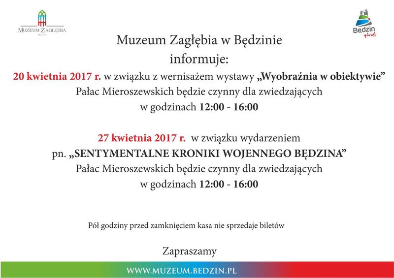 20 kwietnia 2017 r. w Pałacu Mieroszewskich odbył się wernisaż wystawy prac grupy fotograficznej Będzińskiego Uniwersytetu Trzeciego Wieku pt. "Wyobraźnia w obiektywie" pod patronatem Prezydenta Miasta Będzina Łukasza Komoniewskiego.