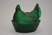Pozostając jeszcze w świątecznych nastrojach prezentujemy eksponat miesiąca, ze zbiorów Działu Etnografii Muzeum Zagłębia, jakim jest pojemnik w kształcie kury, wykonany z zielonego, prasowanego szkła. Kokosz osadzona została na pojemniku imitującym kosz wiklinowy. Pojemnik wykorzystywano do dekoracji świątecznej w okresie Wielkanocy,a także przechowywano w nim słodkości oraz inne produkty spożywcze.