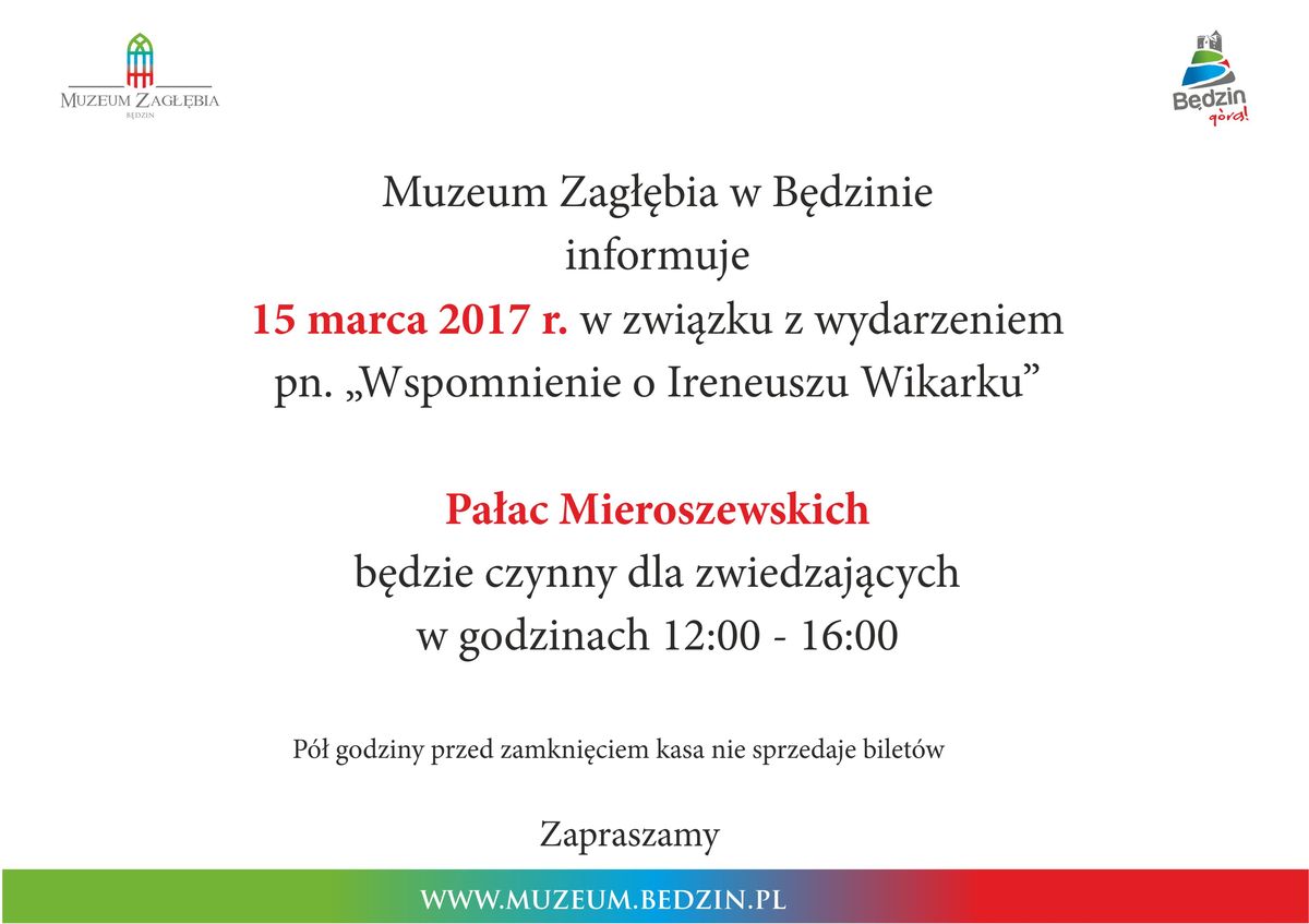 15 marca 2017 r. w Pałacu Mieroszewskich miało miejsce wydarzenie pod nazwą "Wspomnienie o Ireneuszu Wikarku” pod patronatem Prezydenta Miasta Będzina Łukasza Komoniewskiego.