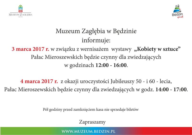 3 marca 2017 r. w Pałacu Mieroszewskich w Będzinie odbył sie wernisaż wystawy "Kobiety w sztuce" pod honorowym patronatem Prezydenta Miasta Będzina Łukasza Komoniewskiego.