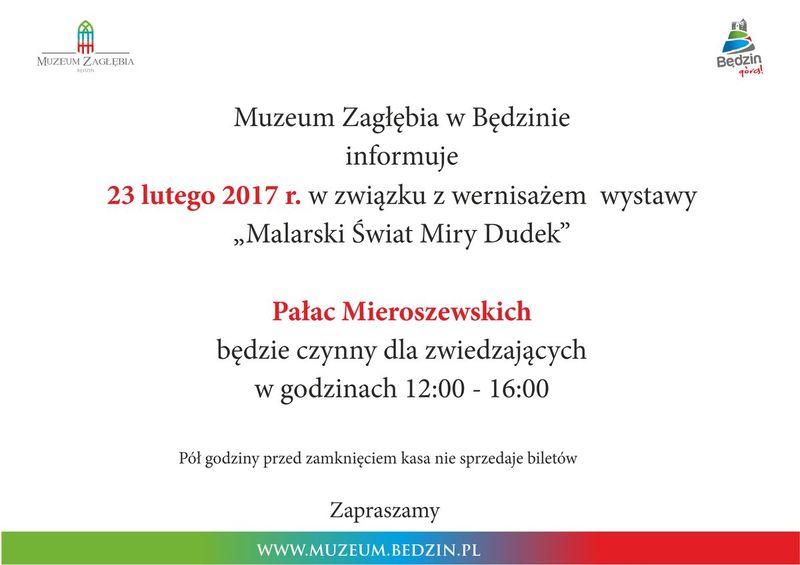 Prezydent Miasta Będzina Łukasz Komoniewski zaprasza na wernisaż wystawy "Malarski świat Miry Dudek". Wernisaż odbędzie się 23 lutego 2017 r. o godzinie 17:00 w Pałacu Mieroszewskich.