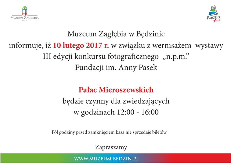 10 lutego 2017 r. w Pałacu Mieroszewskich odbył się wernisaż wystawy „n.p.m.”.