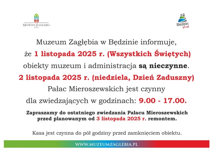 Zapraszamy wszystkich miłośników historii i pięknych wnętrz na ostatnie zwiedzanie w zaduszkową niedzielę, 2 listopada (w godz. 9:00–17:00, zgodnie z czasem w sezonie zimowym).