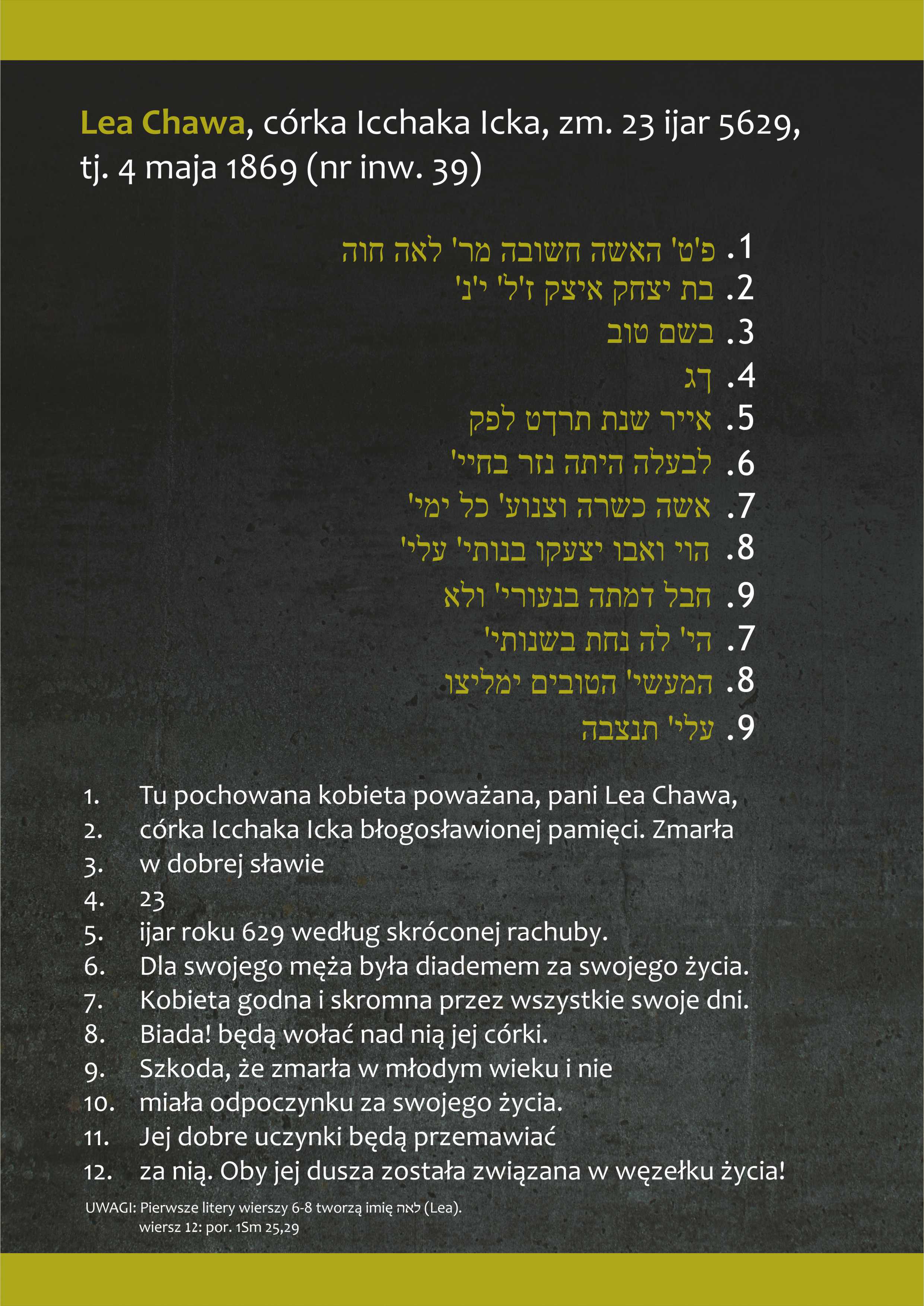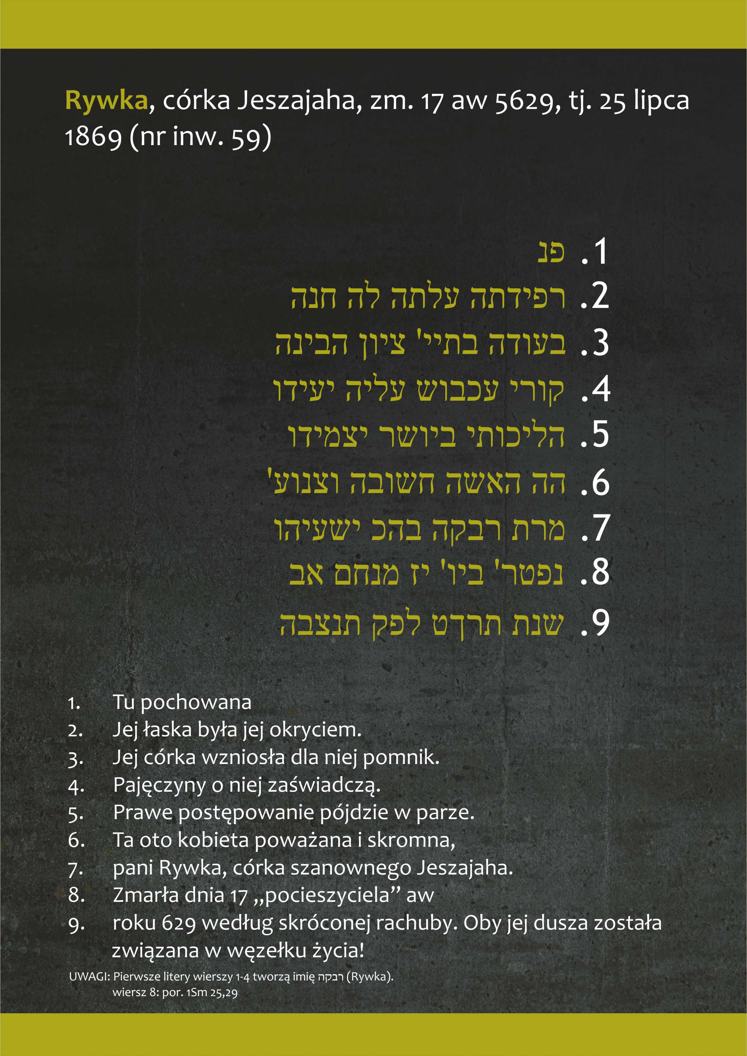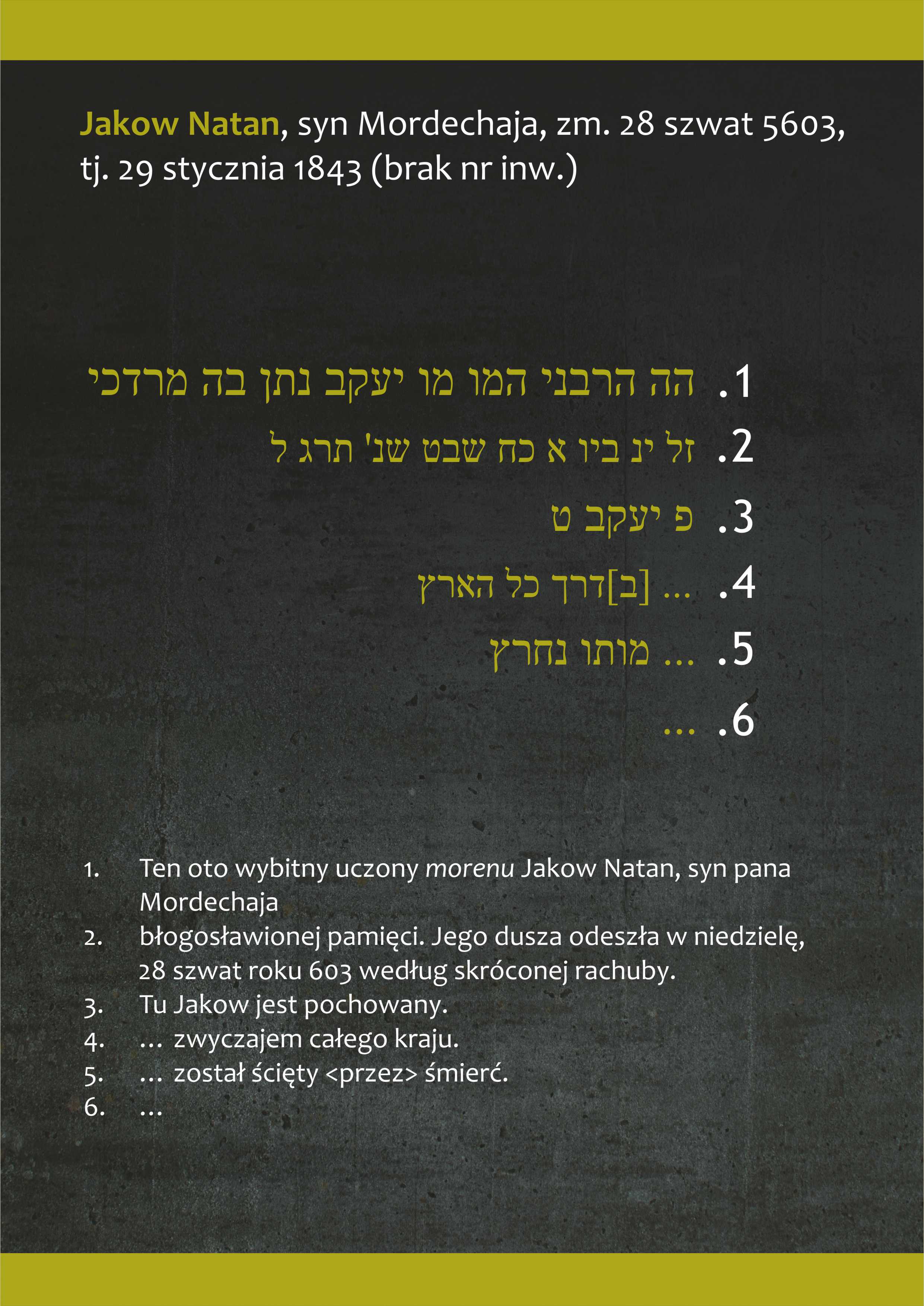 W ramach projektu dr hab. Anna Michałowska – Mycielska, pracownik Instytutu Historycznego Uniwersytetu Warszawskiego, historyk, hebraistka, przetłumaczyła treść inskrypcji nagrobnych z cmentarza na Górze Zamkowej na język polski oraz sporządziła wykaz osób pochowanych na cmentarzu wraz z danymi osobowymi, takim jak imię, nazwisko, imię ojca, data śmierci. Powstała wystawa planszowa prezentująca cmentarz na Górze Zamkowej – jego historię, specyfikę, typowe motywy zdobnicze oraz teksty inskrypcji wybranych nagrobków. Wystawa prezentowana będzie w Pałacu Mieroszewskich – siedzibie Muzeum Zagłębia od stycznia do czerwca 2022 r. Następnie zostanie użyczona do innych zainteresowanych muzeów i instytucji. Prezentacji wystawy w Pałacu Mieroszewskich towarzyszyć będą dwa wykłady: dr hab. Anny Michałowskiej – Mycielskiej - „Inskrypcje na cmentarzu żydowskim w Będzinie” i dra hab. Dariusza Rozmusa - „Motywy zdobnicze na nagrobkach z Góry Zamkowej”.