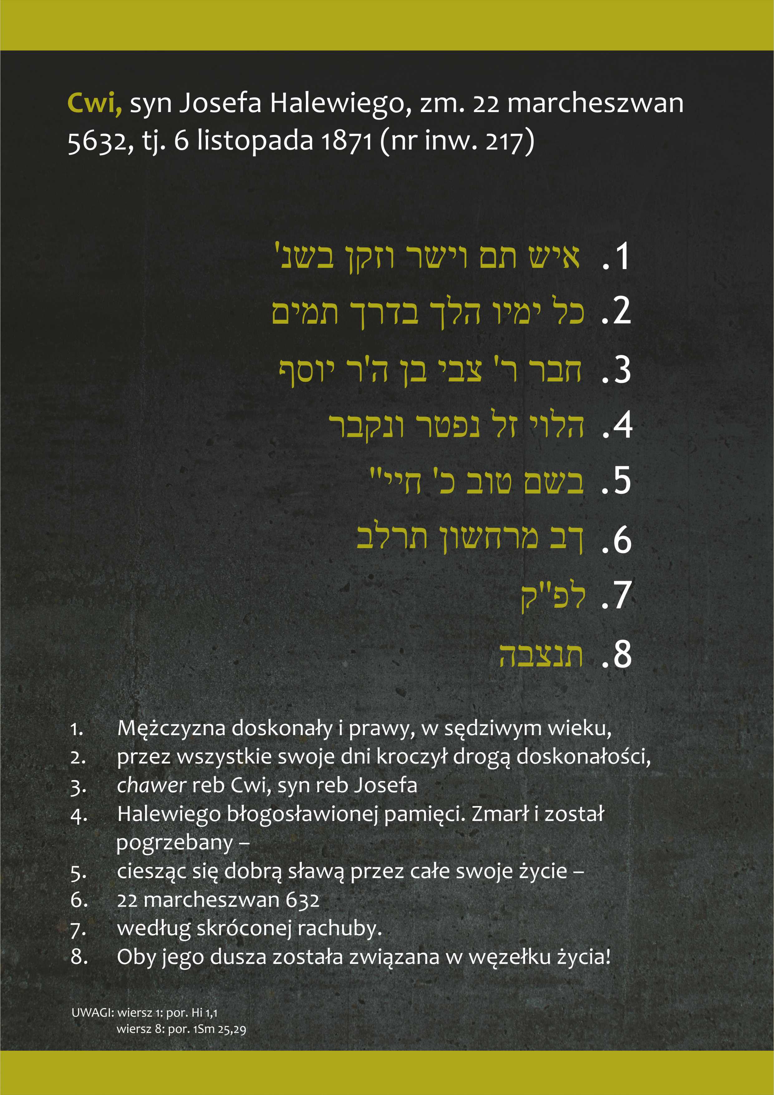 Celem projektu jest przedstawienie walorów kulturowych, jakie posiada cmentarz przy ulicy Podzamcze, będący unikalnym zabytkiem dziedzictwa żydowskiego w mieście. Cmentarze stanowią znakomite źródło informacji o przeszłości lokalnych społeczności żydowskich. Są to zarówno informacje o poszczególnych zmarłych, jak i pokazujące szersze zjawiska dotyczące całej wspólnoty: wierzenia religijne, hierarchię wartości, gusty artystyczne czy też poziom wykształcenia. Ze względu na zapisanie inskrypcji nagrobnych w języku hebrajskim ich treść jest dzisiejszym mieszkańcom Będzina zupełnie nieznana.